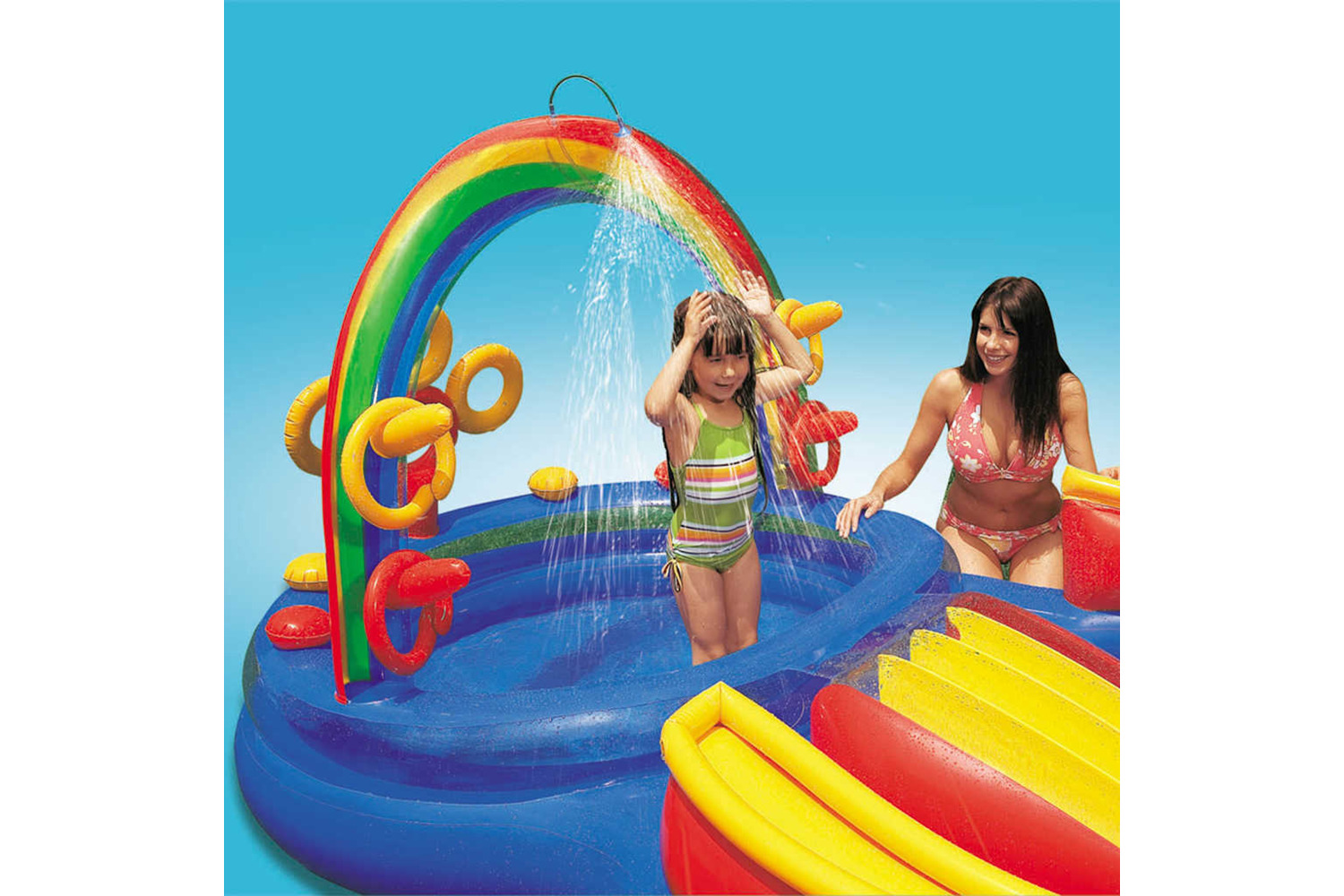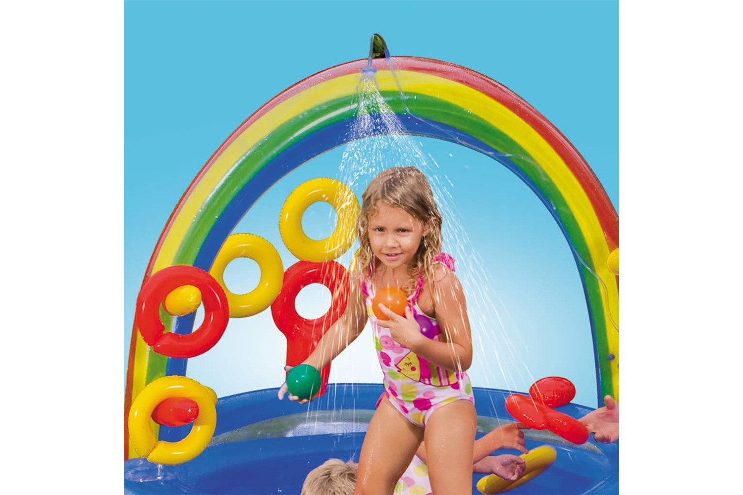 With a maximum load of 81 kg, several children can play together in the pool. This inflatable pool has a rainbow theme. Thanks to the large pool surface area, kids will slide into the wading pool safely. With the four inflatable rings and tossing balls, your kids will enjoy in tossing game with their friends. The water sprayer can keep your children cool. Repair kit is also included in delivery.