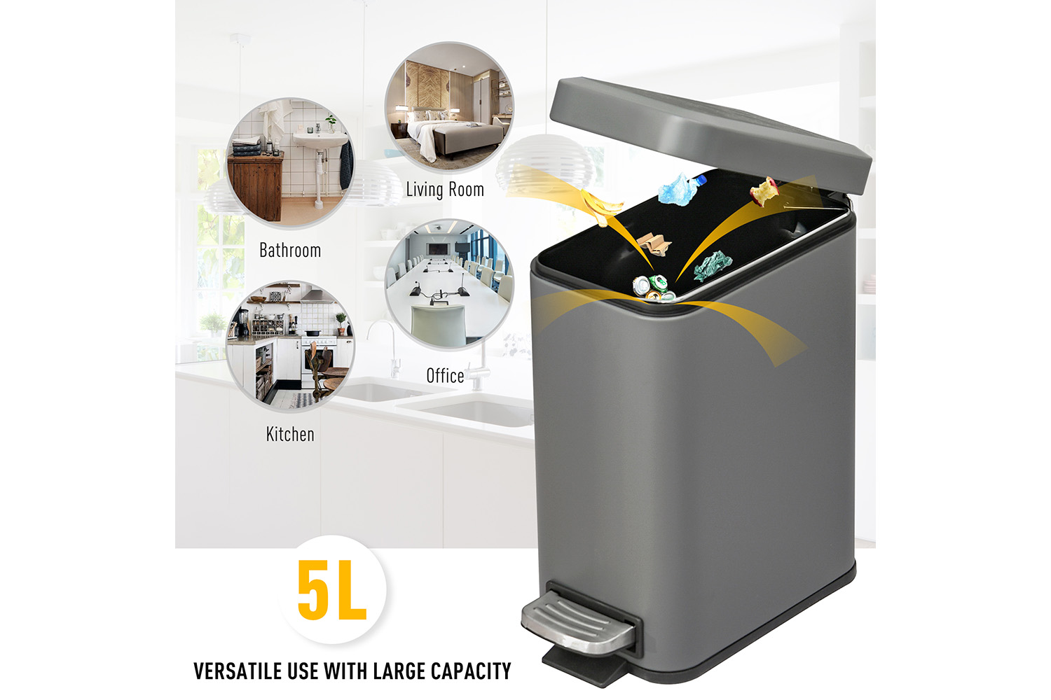 HOMCOM 5L metal bin features simple and compact design, which will perfectly match your interior styling, best choice for living room, dining room, kitchen, study room, bedroom, dorm, office using. Quiet-closed lid design protects the bin itself while do not disturbing you. Durable oversized pedal can make you easily open it from basically any point. Durable and strong construction allows long-lasting using.