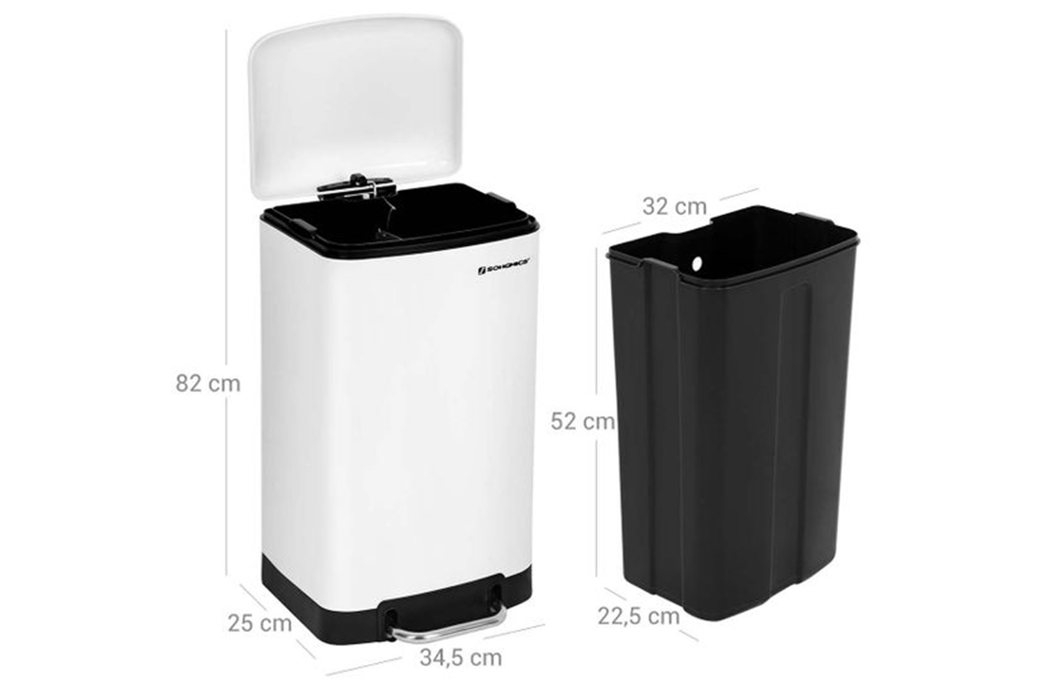 Large capacity (30L volume for 50-60L garbage bags) in rectangular shape with compact dimensions (34 x 61.5 x 27.5 cm); the waste bin with odour-proof closure prevents annoying smells of rubbish.