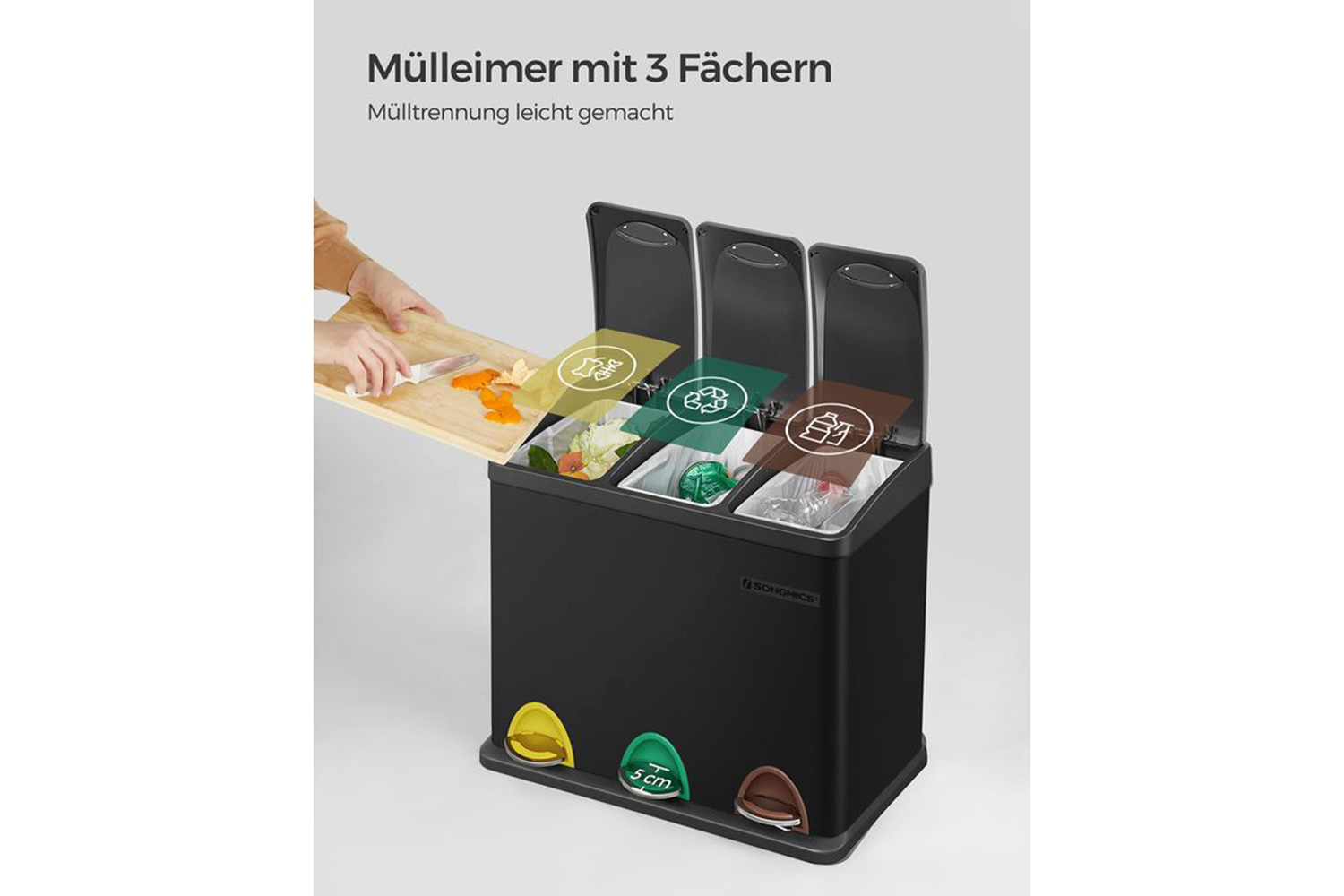 Recycling? Really not complicated! With this pedal bin with 3 separate compartments, you can easily sort your waste, e.g. residual waste and organic waste. All you have to do is step on the pedal and throw the waste into the inner bin. You don't even have to touch the bin with your hand, which ensures hygiene.