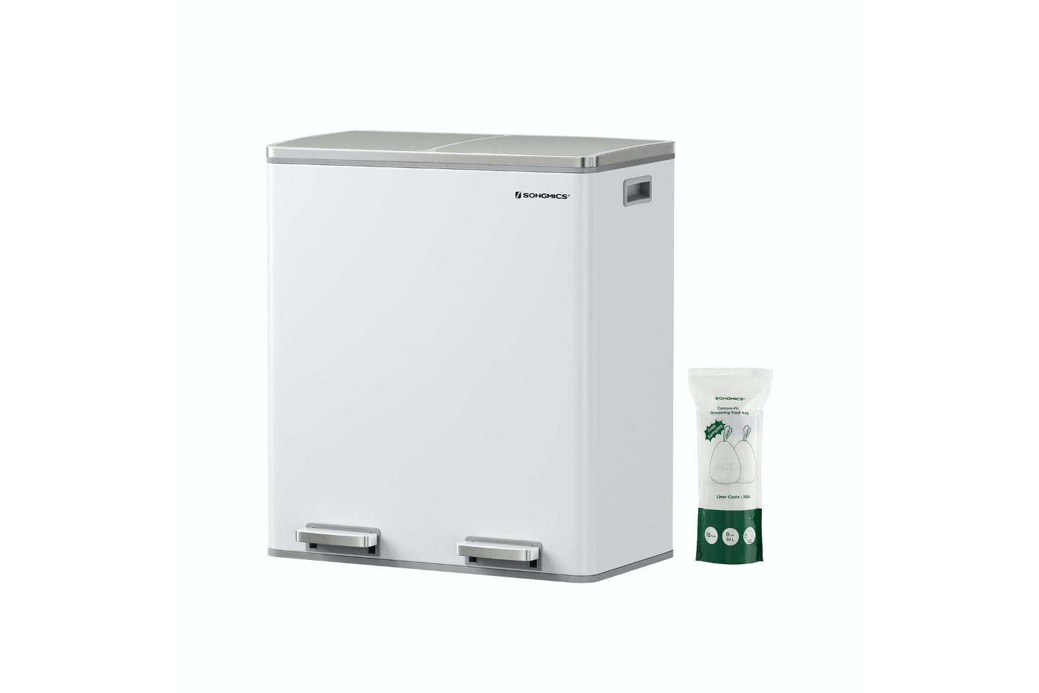 A dual trash can with two 30L bins, 15 trash bags, plastic inner buckets, and soft closure mechanism for easy waste disposal