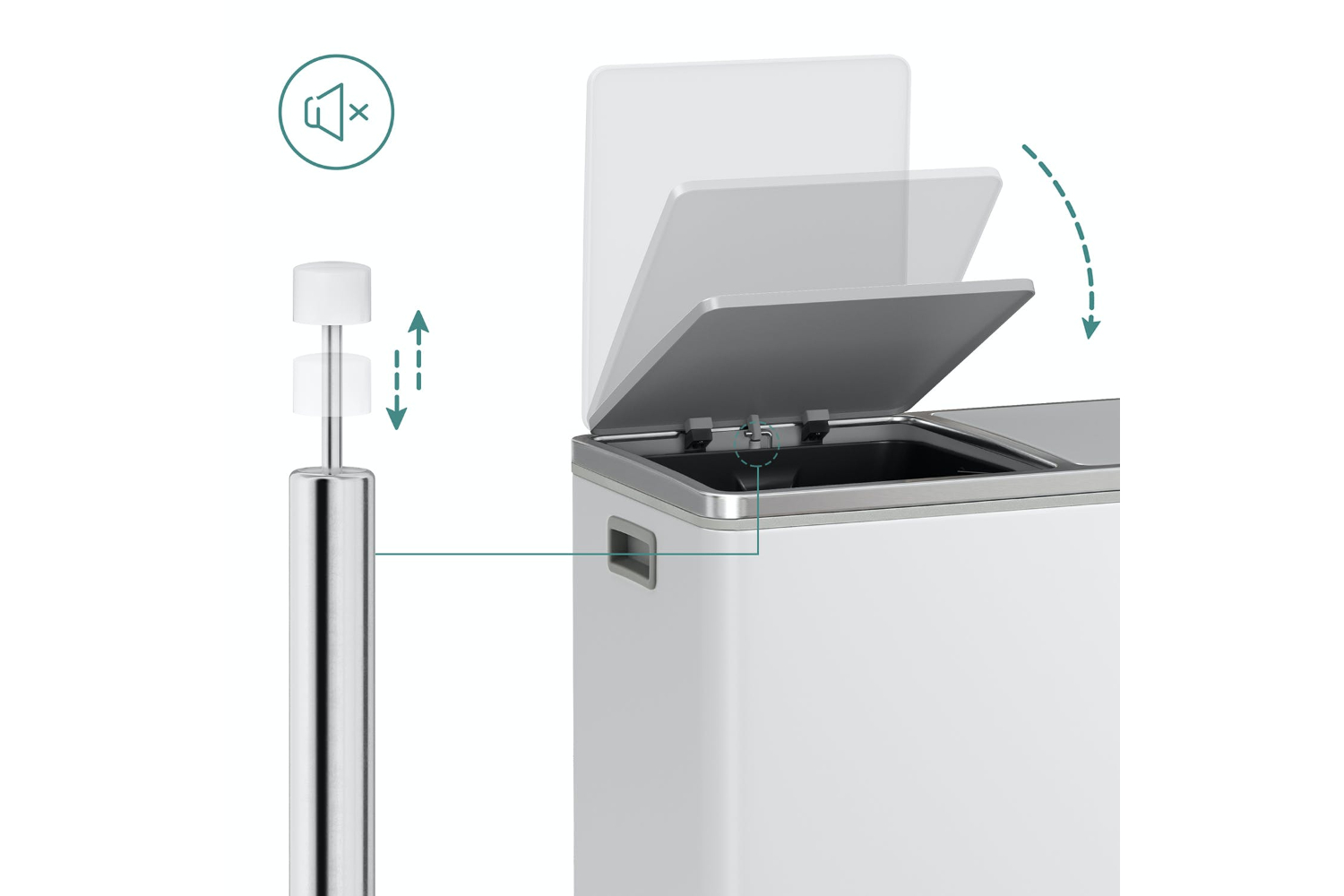 Though made with a rigid metal exterior, the recycle bin is gentle—the buffer mechanism makes the lids close softly, slowly, and silently, keeping germs and odors at bay without a loud clang