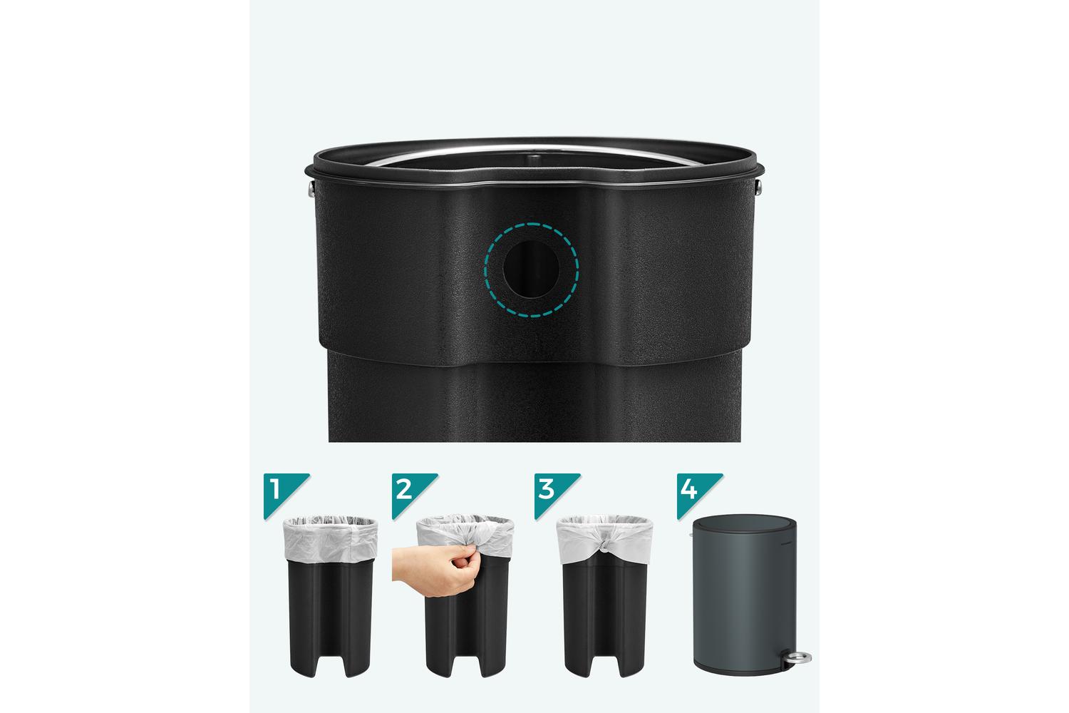 Built to last, the steel outer container is rust-resistant, easy to clean, and designed to withstand daily use. The coated surface not only looks sleek but also ensures durability and easy maintenance. Inside, a removable plastic inner bin with a handy handle makes emptying and cleaning a breeze. The clever inner bin design features an opening to secure your trash bag, keeping it taut and hidden from view for a neat, uncluttered look.