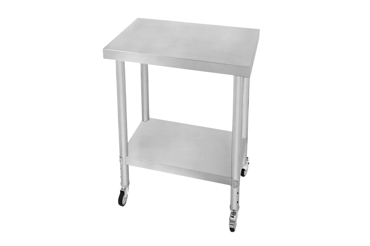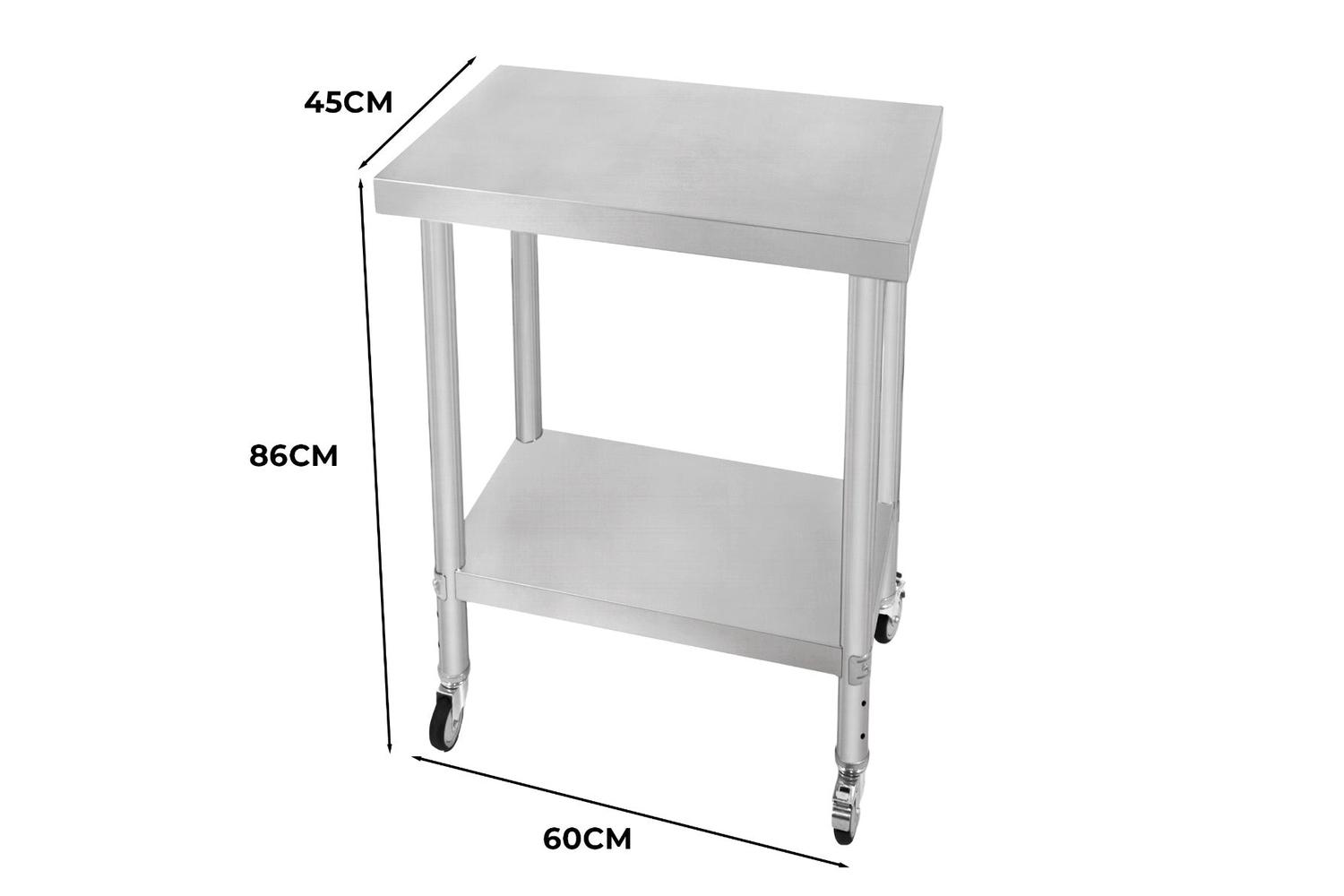 Constructed from high-quality 201 stainless steel, this table is crafted with the durability to endure frequent use in demanding environments. Providing a spacious surface of 60cm x 45cm for chopping, preparing, and assembling, this compact model is perfect for businesses with limited space. The robust design ensures a remarkable weight capacity of 80kg on both the tabletop and the lower shelf, enabling you to store heavier items securely and execute your tasks without any hassle.