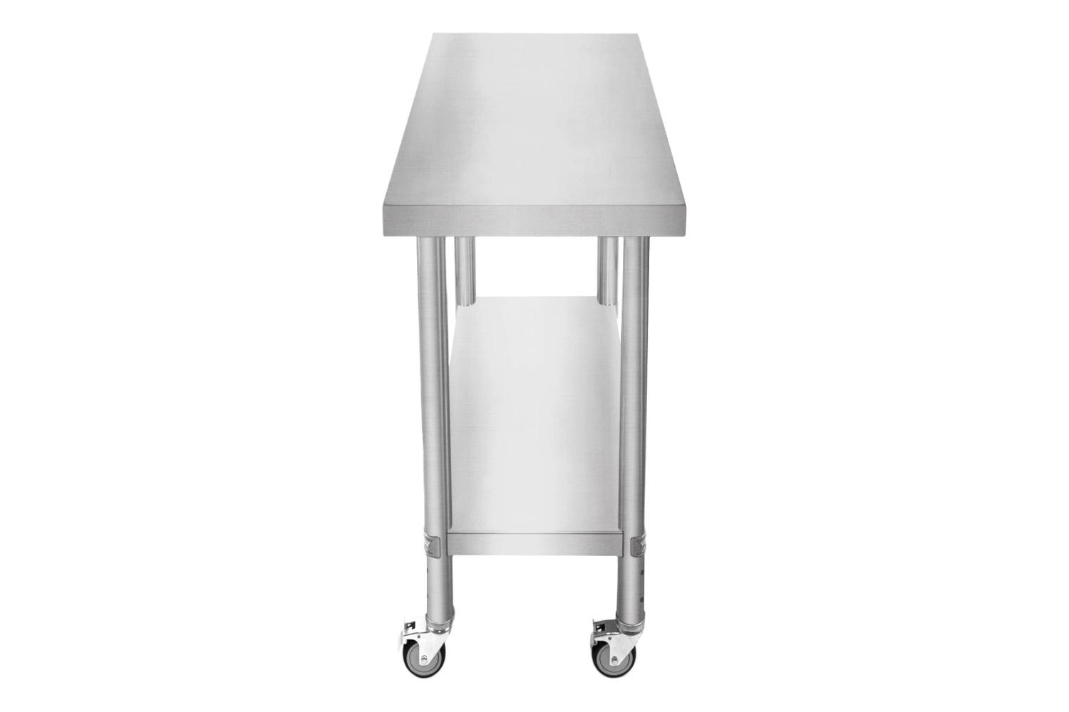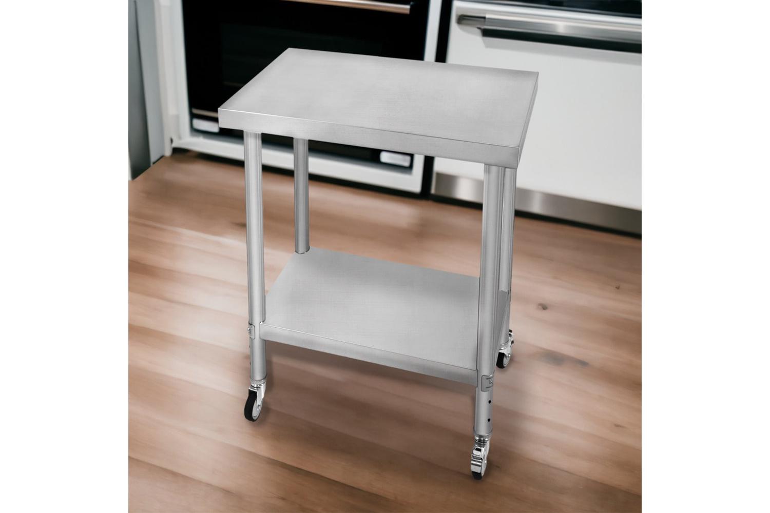 The aforementioned commercial kitchen table features four castor wheels for smoothly moving the table wherever you require it. Complete with two brakes, you can lock the table securely in place when in operation, ensuring safety and stability. Along with four adjustable bullet feet, this work table perfectly combines mobility with the option to remain stationary, adapting to your busy kitchen pace and unique requirements.