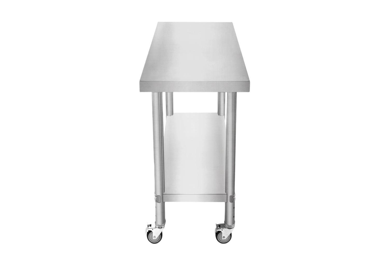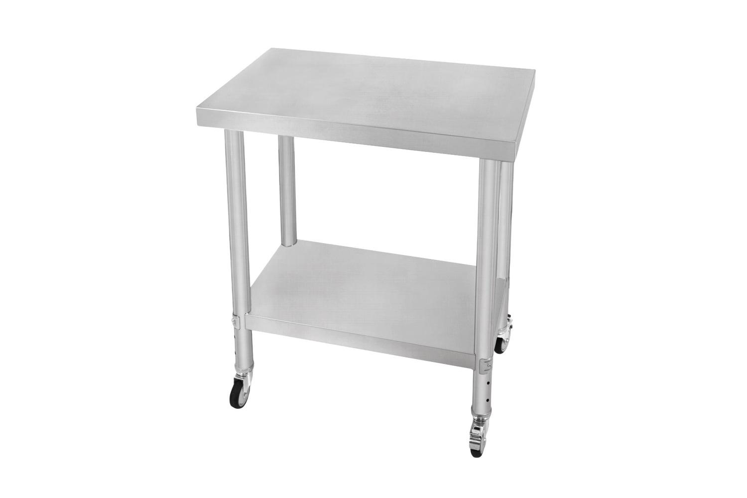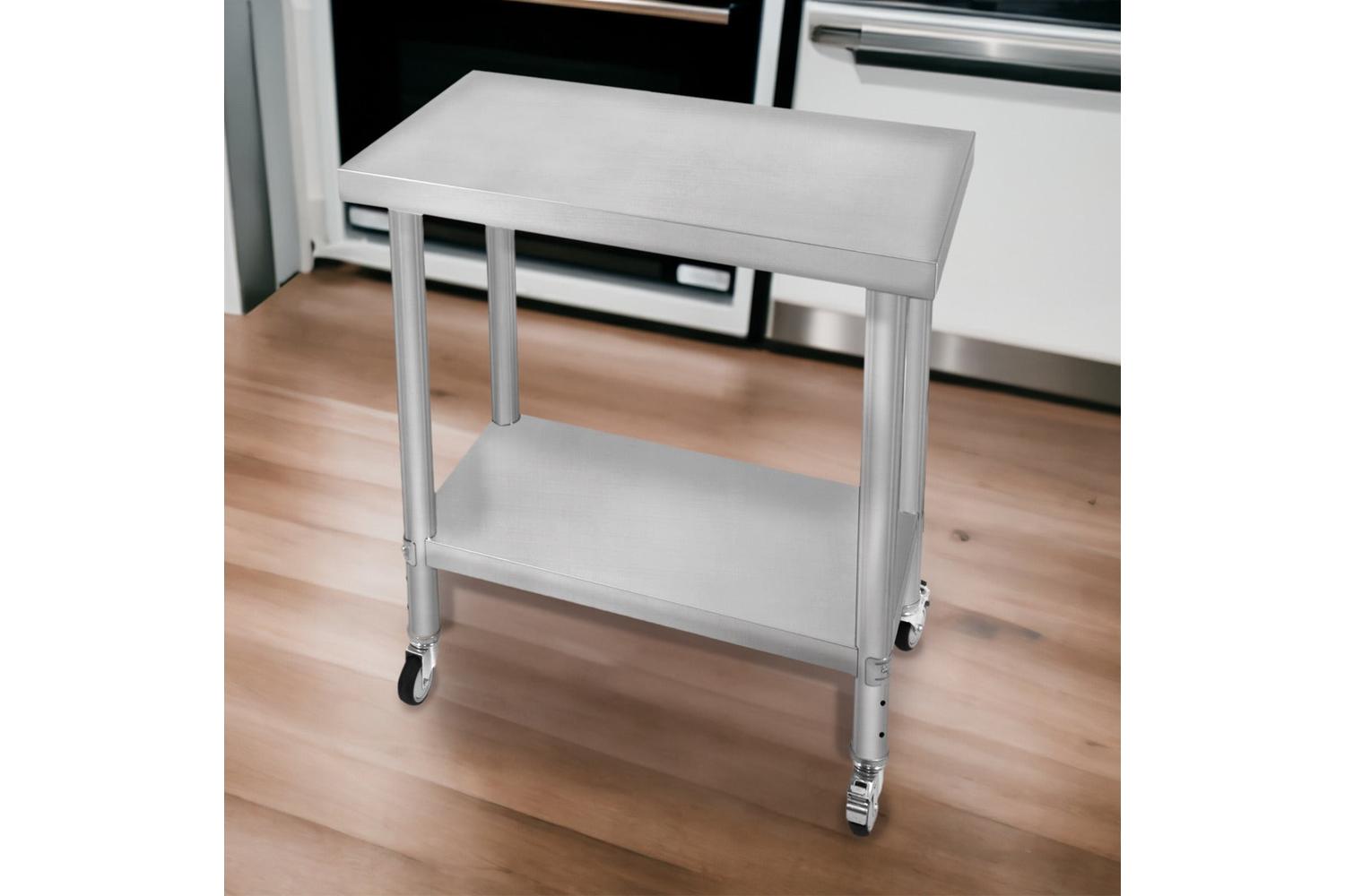 Thanks to the inclusion of an advantageous undershelf, storage is thoughtful and space-saving. It securely accommodates your culinary supplies, equipment, or small appliances offering you easy access. Further enhancing its versatility are the four caster wheels which grant smooth manoeuvrability around the workspace. Two of these wheels have brakes to ensure a stable, secure surface when the table is stationary.