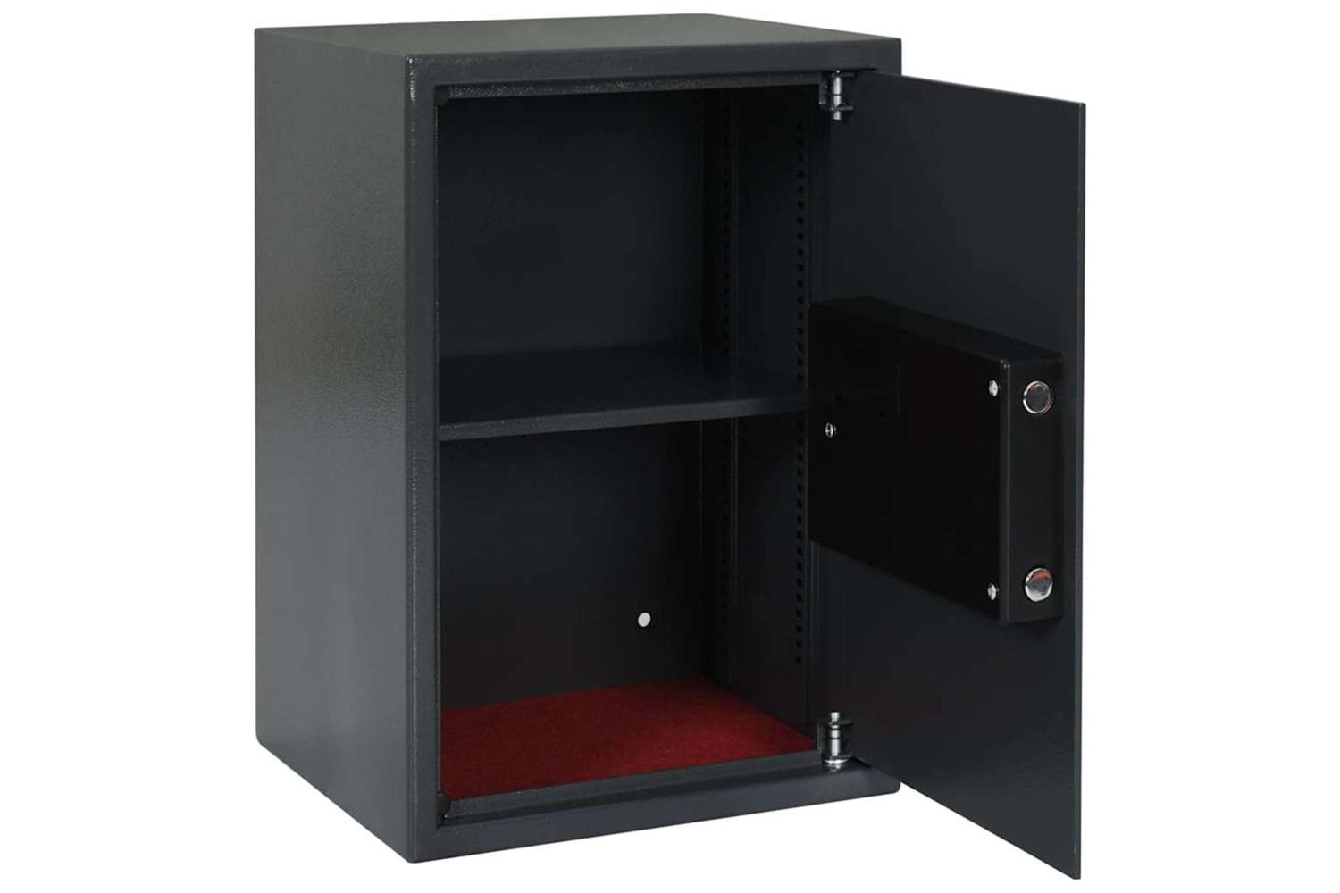 • Advanced Electronic Lock This safe comes with an electronic locking system, offering a modern touch with keyless access. You can set your own code or even use fingerprint recognition for extra safety, making it perfect for busy offices.
