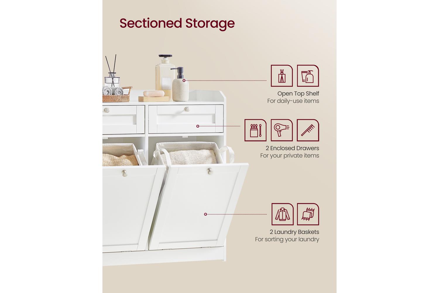 Designed for busy households, this bathroom cabinet offers a spacious countertop for toiletries, two easy-access drawers for smaller essentials, and two integrated laundry bins to keep dirty clothes out of sight. The removable and portable laundry bags are a game-changer for laundry day—simply lift them out using the double handles and carry them straight to the washing machine. The water-repellent coating inside each bag ensures they stay fresh and are easy to clean, making maintenance a breeze.