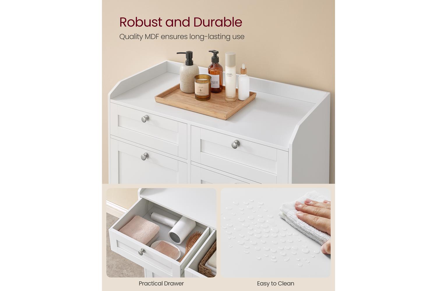 Durability and safety are at the heart of the VASAGLE Bathroom Cabinet. Each laundry compartment is reinforced with sturdy trapezoidal panels and fitted with robust metal hinges, providing reliable support and a long lifespan. The raised shelf design prevents your items from slipping off, while the included anti-tip hardware secures the cabinet to the wall, giving you peace of mind in busy family bathrooms.