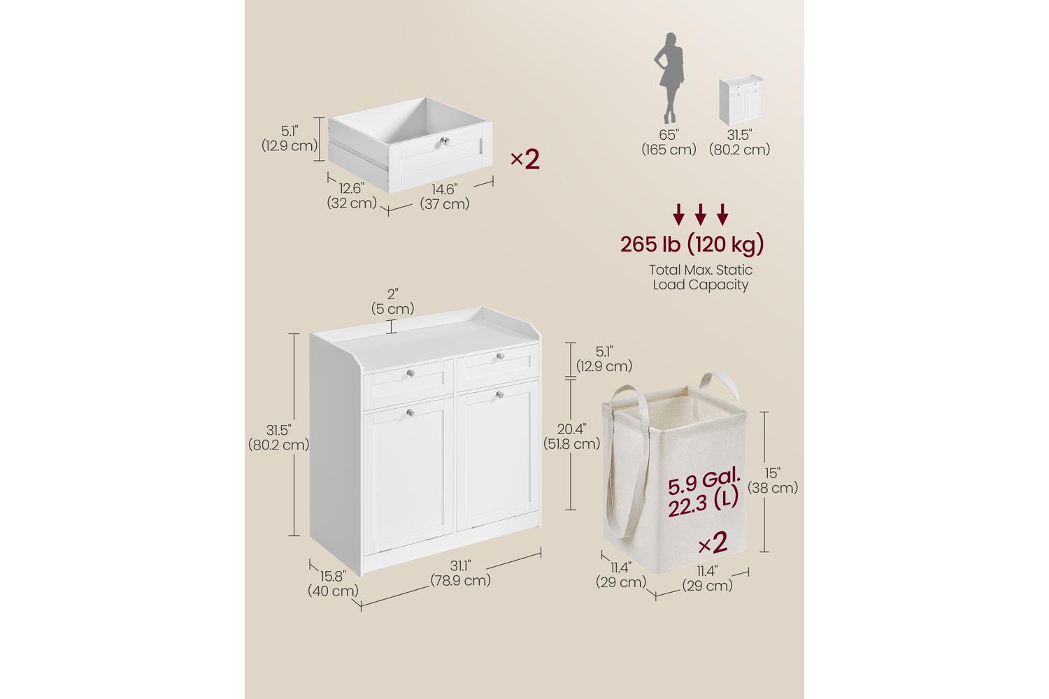 - Includes: 2 drawers, 2 laundry bins with removable bags, countertop, anti-tip kit