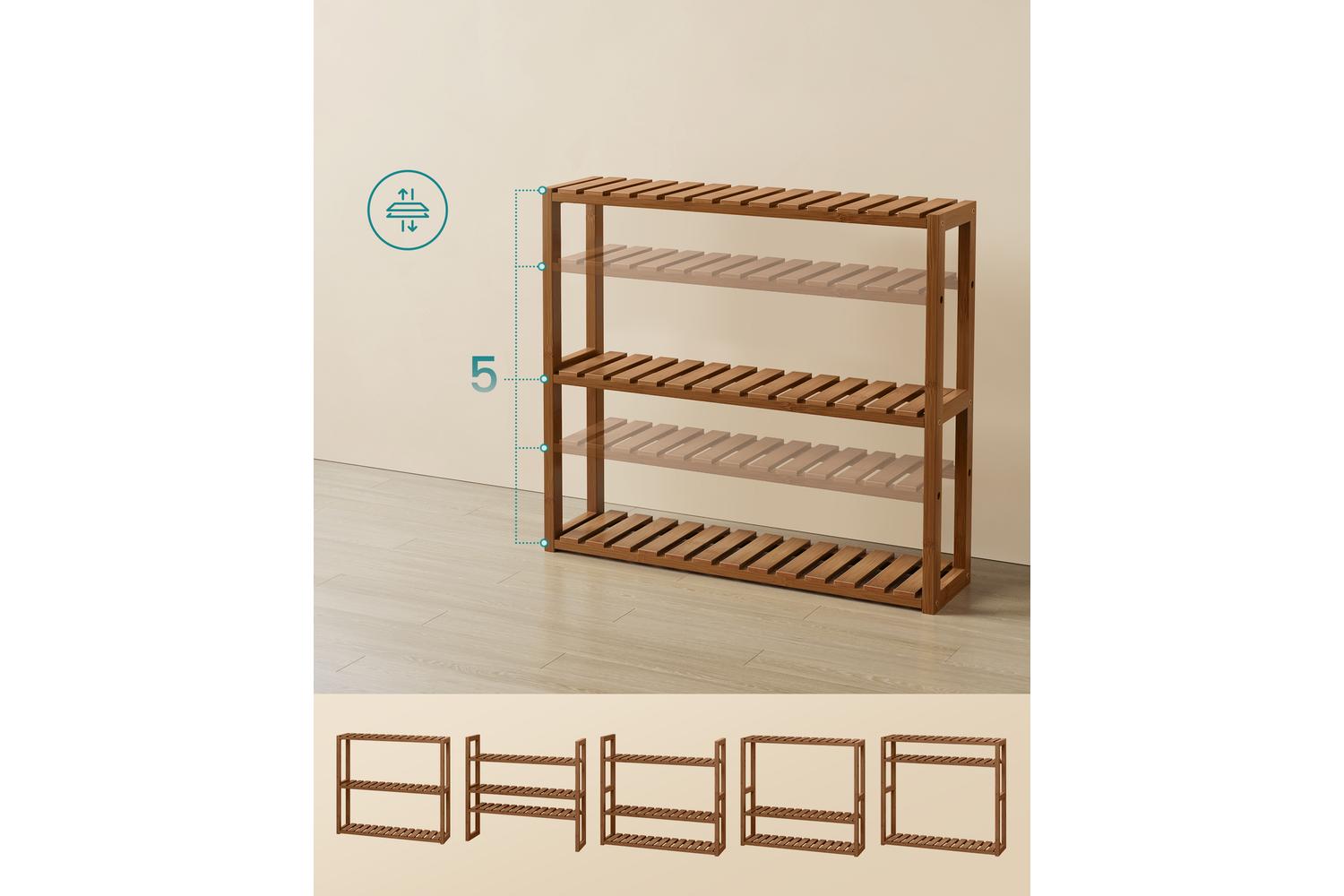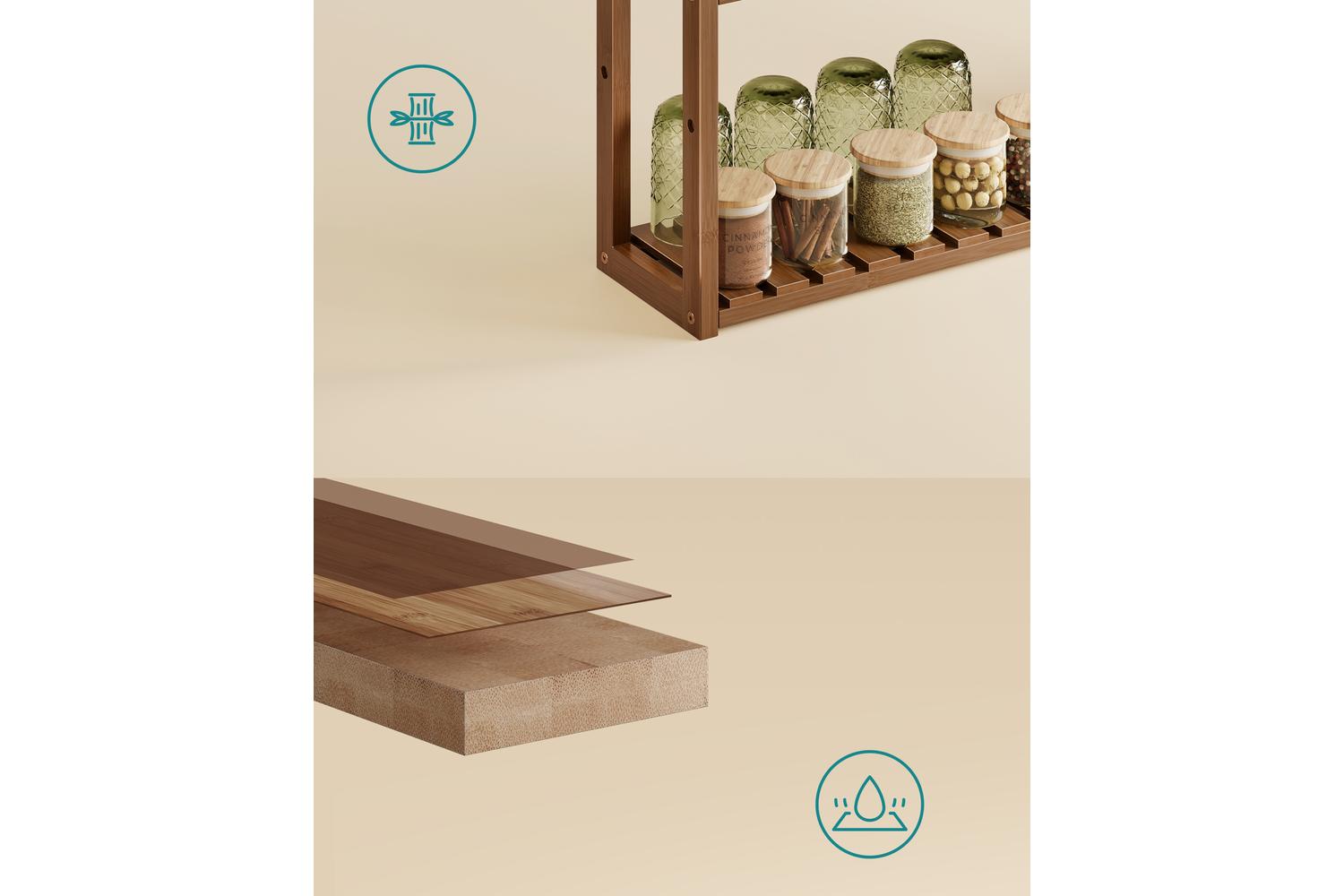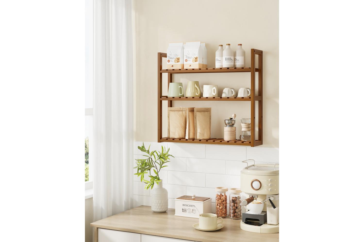 - Three-tier bamboo storage rack in a warm caramel brown finish