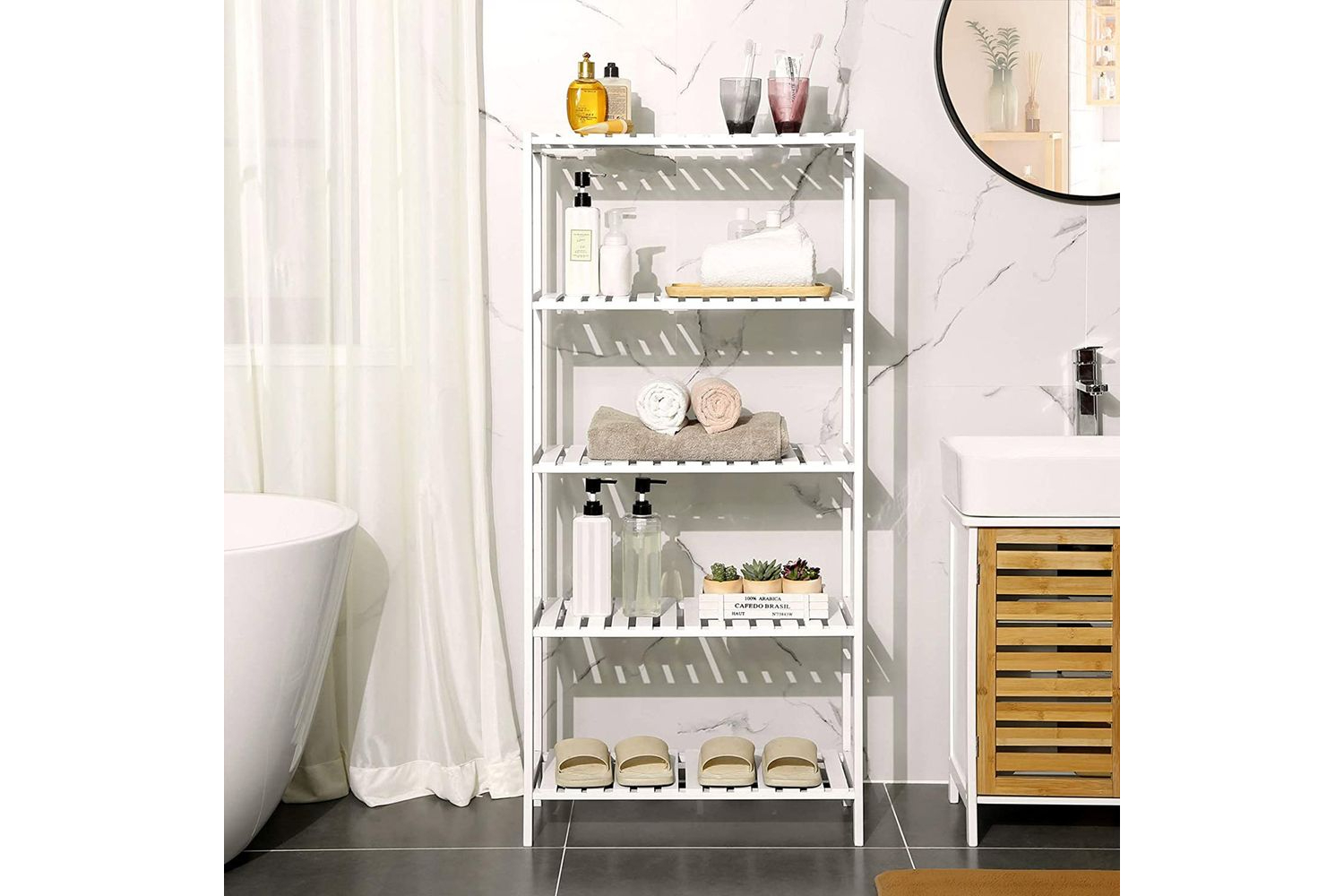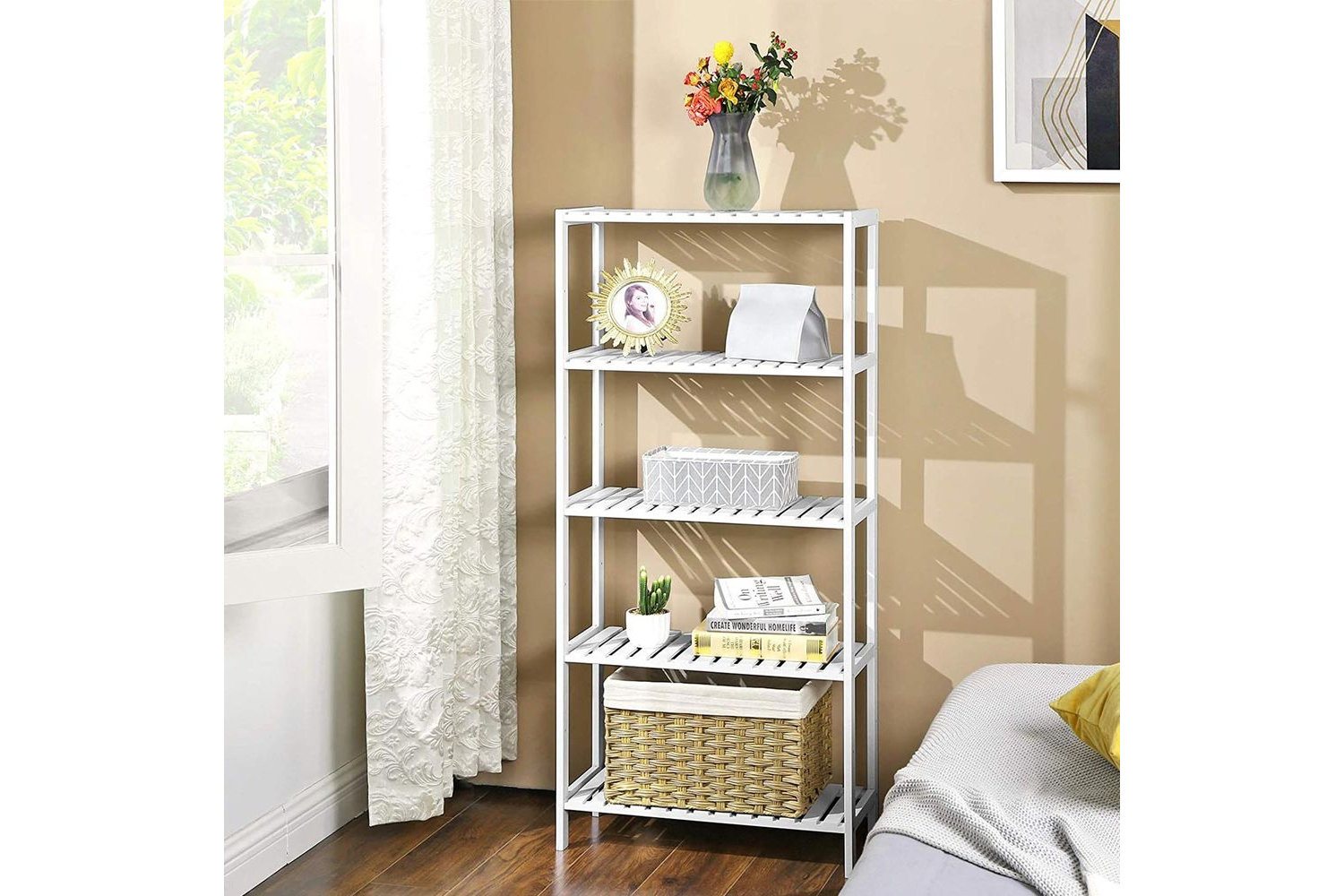 IN LOVE WITH SHELVING: No space wants to miss a shelf like thisa cornucopia of storage that also feels a bit modern and relaxing; with an airy display of adjustable shelves, your heart will see everything you love, and your head will be satisfied by the orderWHATS YOUR PLAN Set this all-around stand in the bathroom for lotions and towels, in the living room for books and trinkets, in the kitchen for pots and pans, on the balcony for blooming flowers, in the hallway for shoes, in the cellar, garage, or anywhere elseBAMBOO BENEFITS: Theres more to this beautiful bamboo storage shelf than just charming looks; bamboo is chosen for its durable, low-carbon, and renewable qualities that make it a go-to choice for green homes (shelf max. load: 10 kg ea.)NO-BRAINER ASSEMBLY: You dont have to be a handyman, as each side frame comes in an integral piece; simply connect the shelves with the side frame, you will have this refreshing shelf set up in no timeInternational products have separate terms, are sold from abroad and may differ from local products, including fit, age ratings, and language of product, labeling or instructions.Specifications:- Colour: White- Material: Bamboo- Product Size: 60 x 26 x 130 cm (L x W x H)- Product Weight: 5.7 kg- Max. Static Load Capacity of Each Shelf: 10 kg Package Contents:- 1 x 5-Tier Bamboo Shelf- 1 x Anti-Tip Kit- 1 x Accessory Kit- 1 x Instructions (EN, DE, FR, ES, IT)