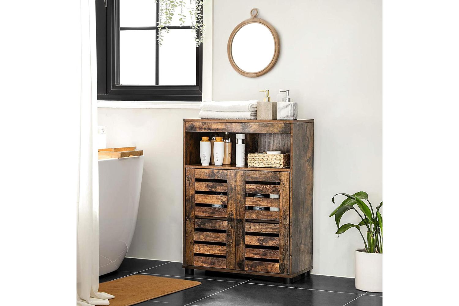 Step into timeless style with this rustic brown floor cabinet. The VASAGLE washbasin cabinet is at once charming and delicate, featuring original louvred doors and rustic accents that seamlessly compliment a vibe of aesthetic sophistication.