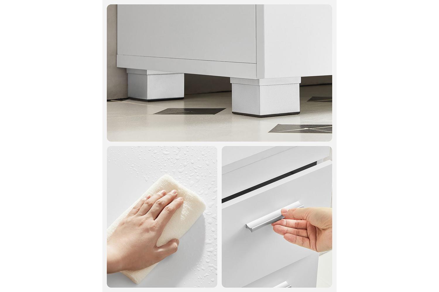 Two spacious compartments behind the cabinet door and three side drawers readily accommodate your bathroom essentials. From towels to toiletries to cleaning supplies, everything will have a specific place, delivering an easy and hassle-free organisation. Should your bathroom floor become drenched, the practical feet will keep your cabinet safe and dry.