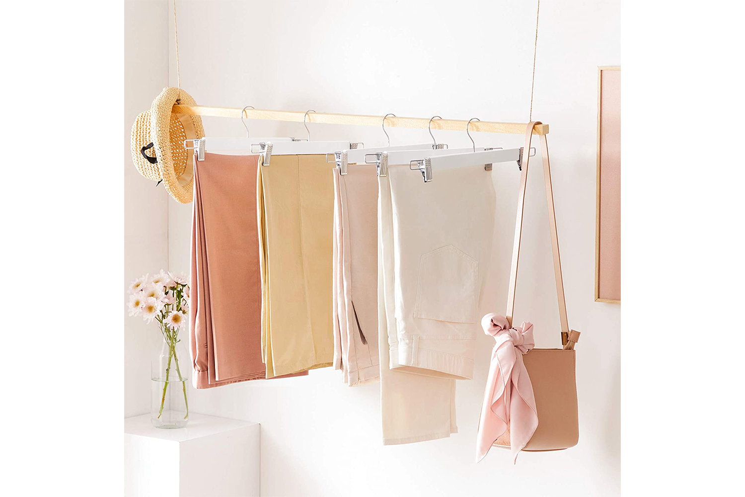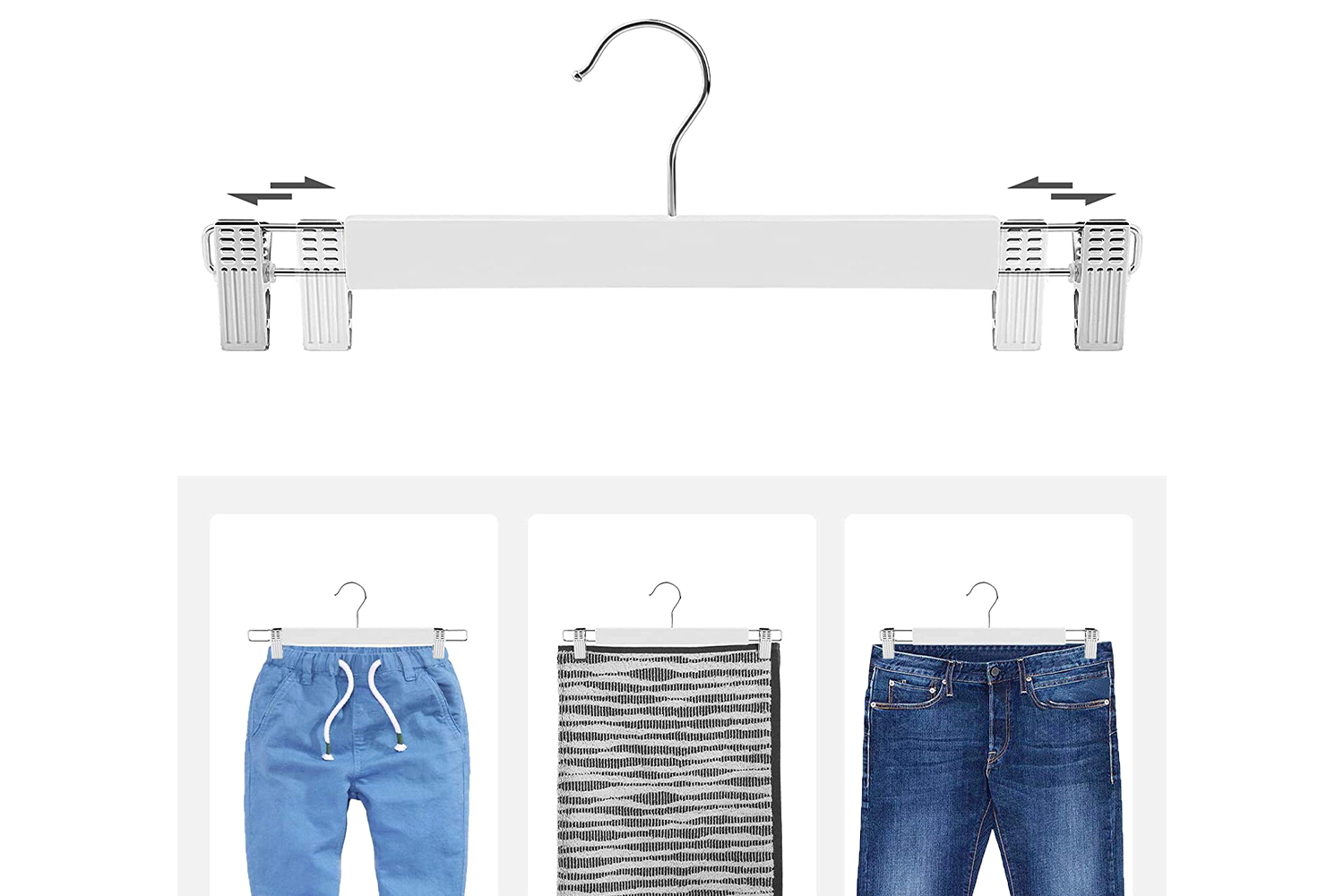2 clips with non-slip pads allow each hanger to hold your clothes tightly without leaving any marks. And the distance between the clips can be adjusted to fit pants of different sizes. What else? Textured tops help you open the clips easily.