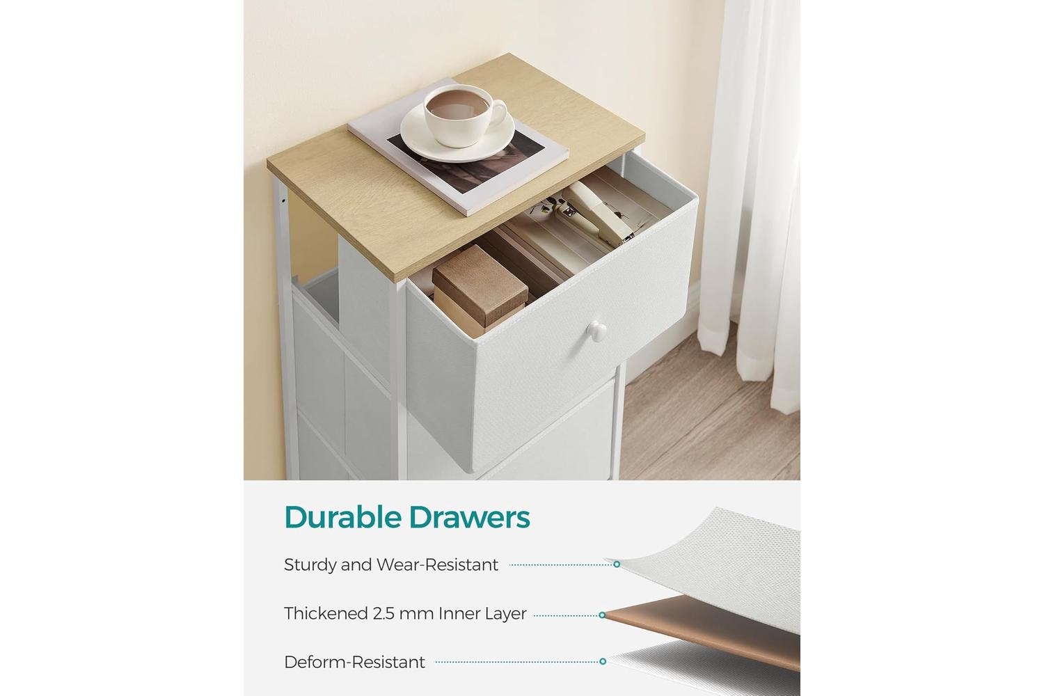 Crafted from durable particleboard, sturdy steel, and non-woven fabric, the SONGMICS Dresser Unit is built to last. The robust construction ensures stability, while the lightweight design allows for easy repositioning whenever you fancy a change. Each drawer glides smoothly, providing ample space for clothes, accessories, or household essentials. The spacious tabletop is perfect for displaying photos, plants, or your favourite decorative pieces, making this dresser as attractive as it is practical.