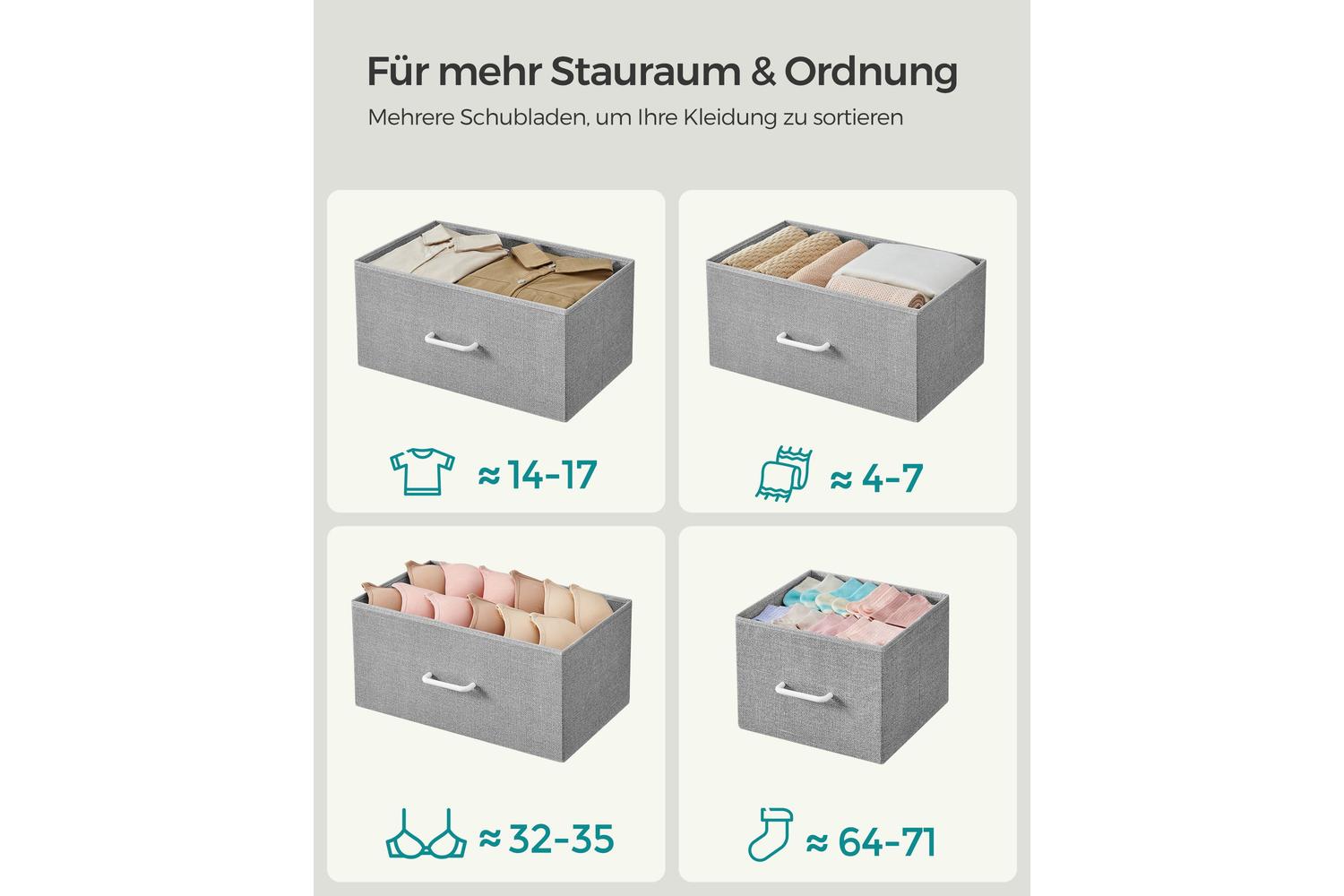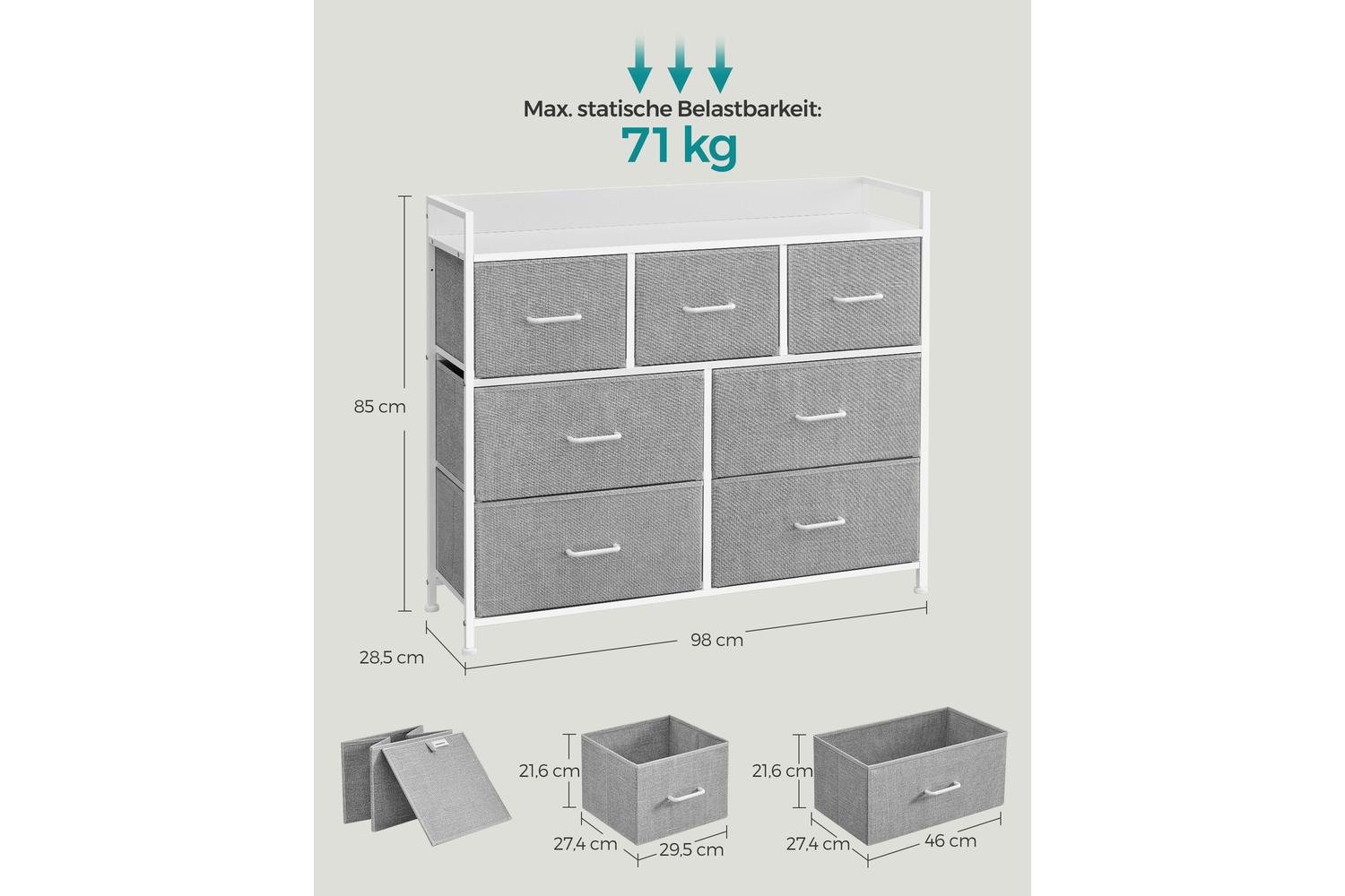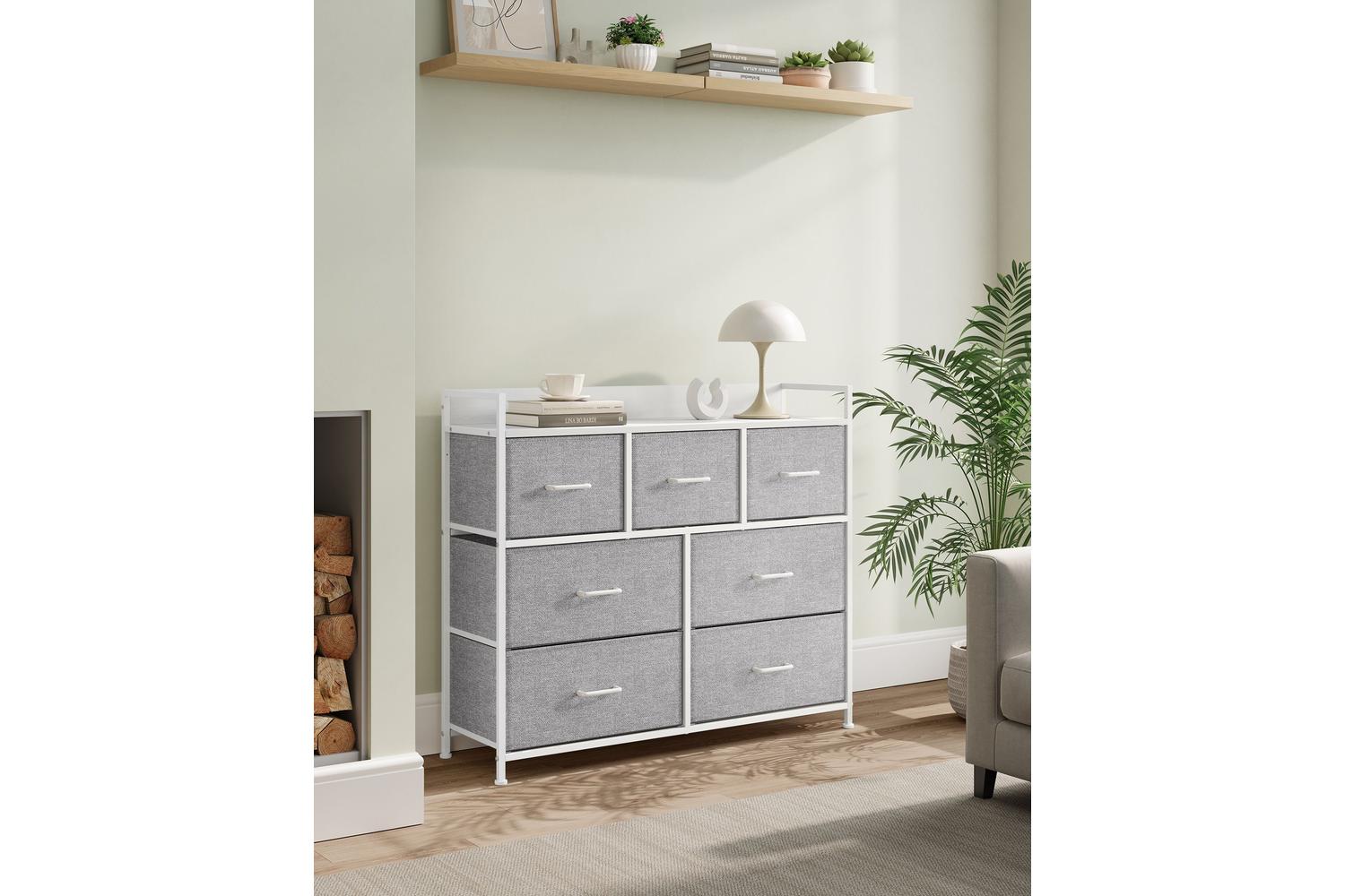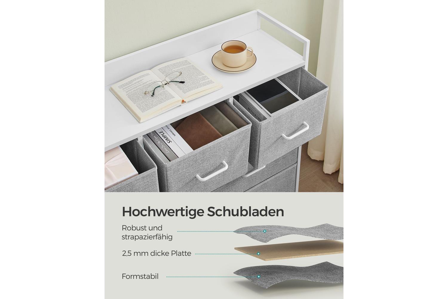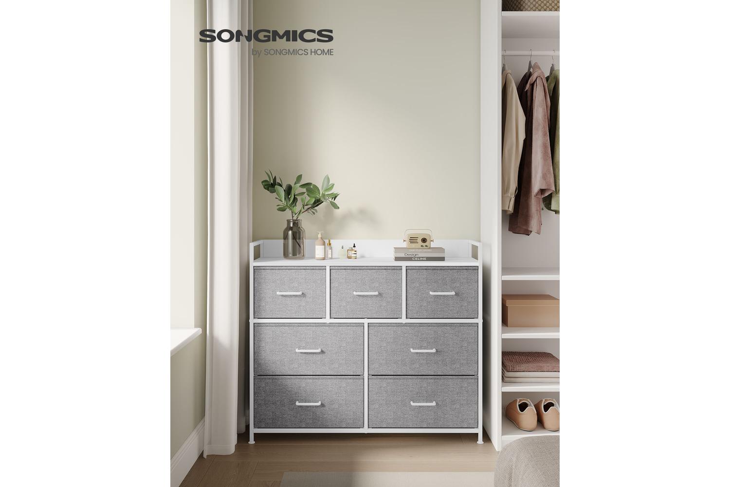 Crafted with a sturdy steel frame and a durable particleboard top, the SONGMICS Dresser Unit ensures long-lasting performance and stability. The fabric drawer fronts in elegant Dove Grey and Cloud White add a soft touch, making it easy to match with any décor. With a spacious design featuring both small and large drawers, you will have ample room to organise everything from jumpers and jeans to socks and scarves. The smooth-gliding drawers make accessing your belongings effortless, while the robust tabletop is ideal for displaying photos, plants, or decorative items.