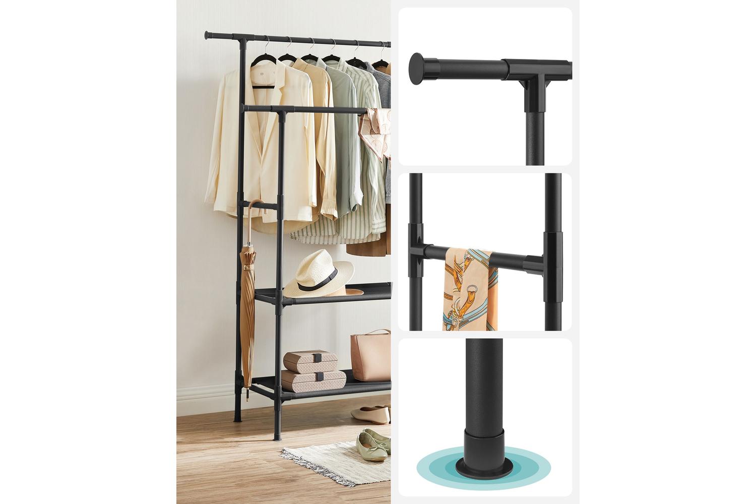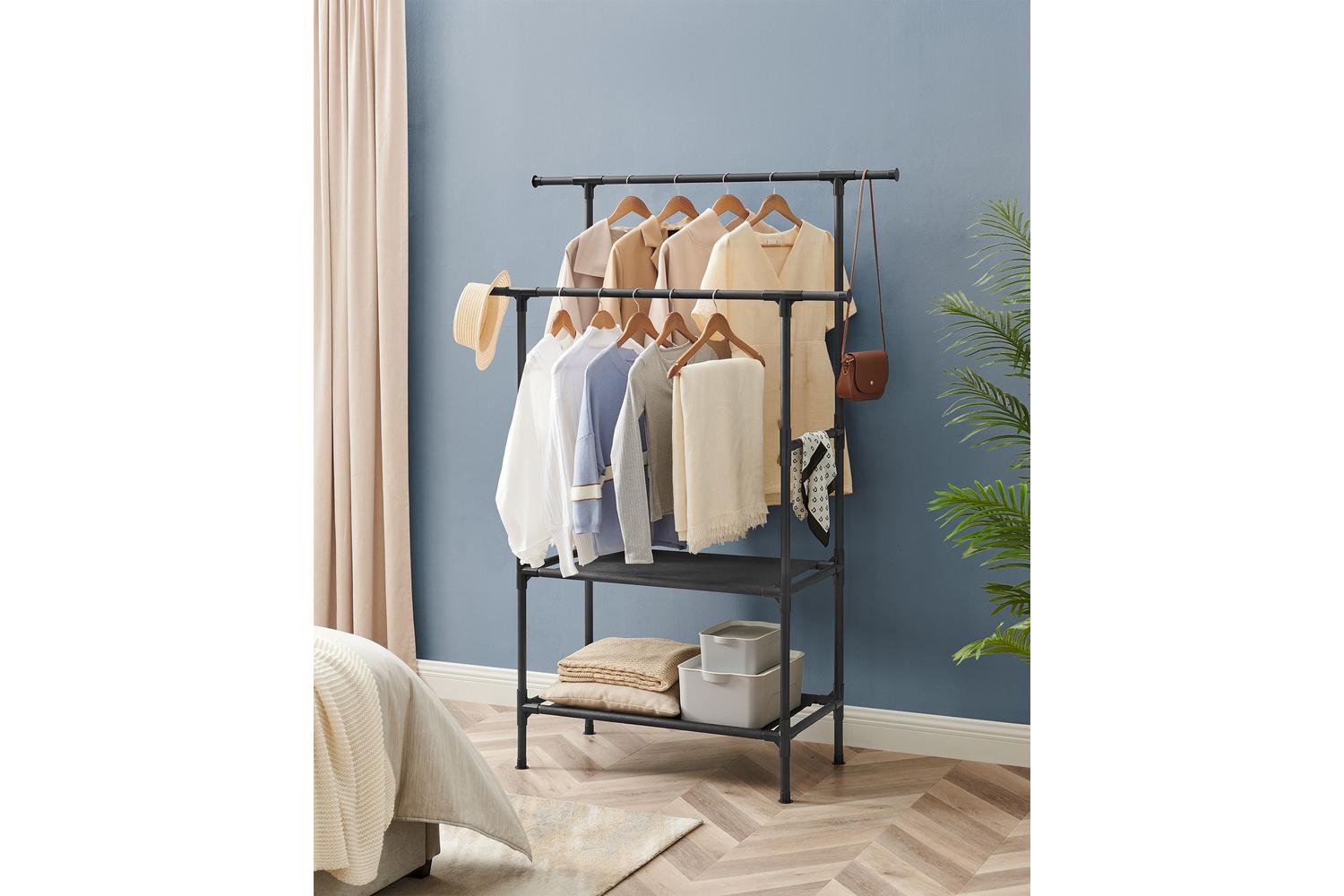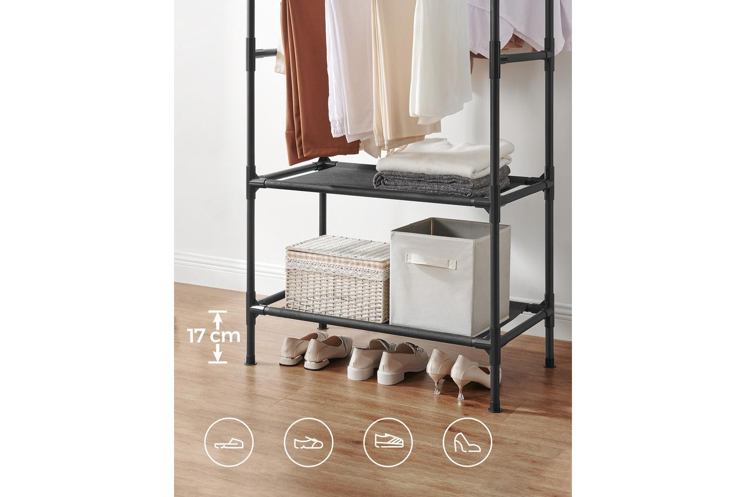 The rack's double-shelf feature is one-of-a-kind—offering twice the storage space. Store your designer bags on one shelf and display your sneakers or heels on the other. The days of wasting valuable time searching for your matching pair of shoes or favourite bag are finally over. Simply take a glance at your neatly arranged SONGMICS Clothes Rack, and you're good to start your day in style.
