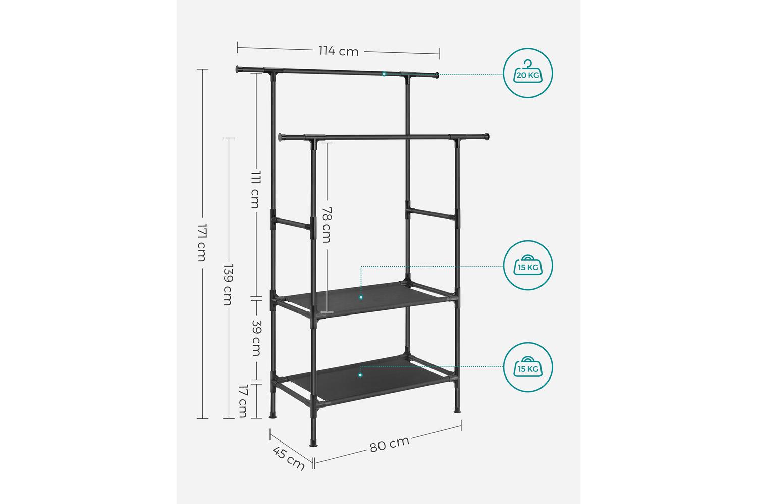 - Max. static load capacity: Total - 70 kg, Shelf - 15 kg, Clothes Rail - 20 kg.