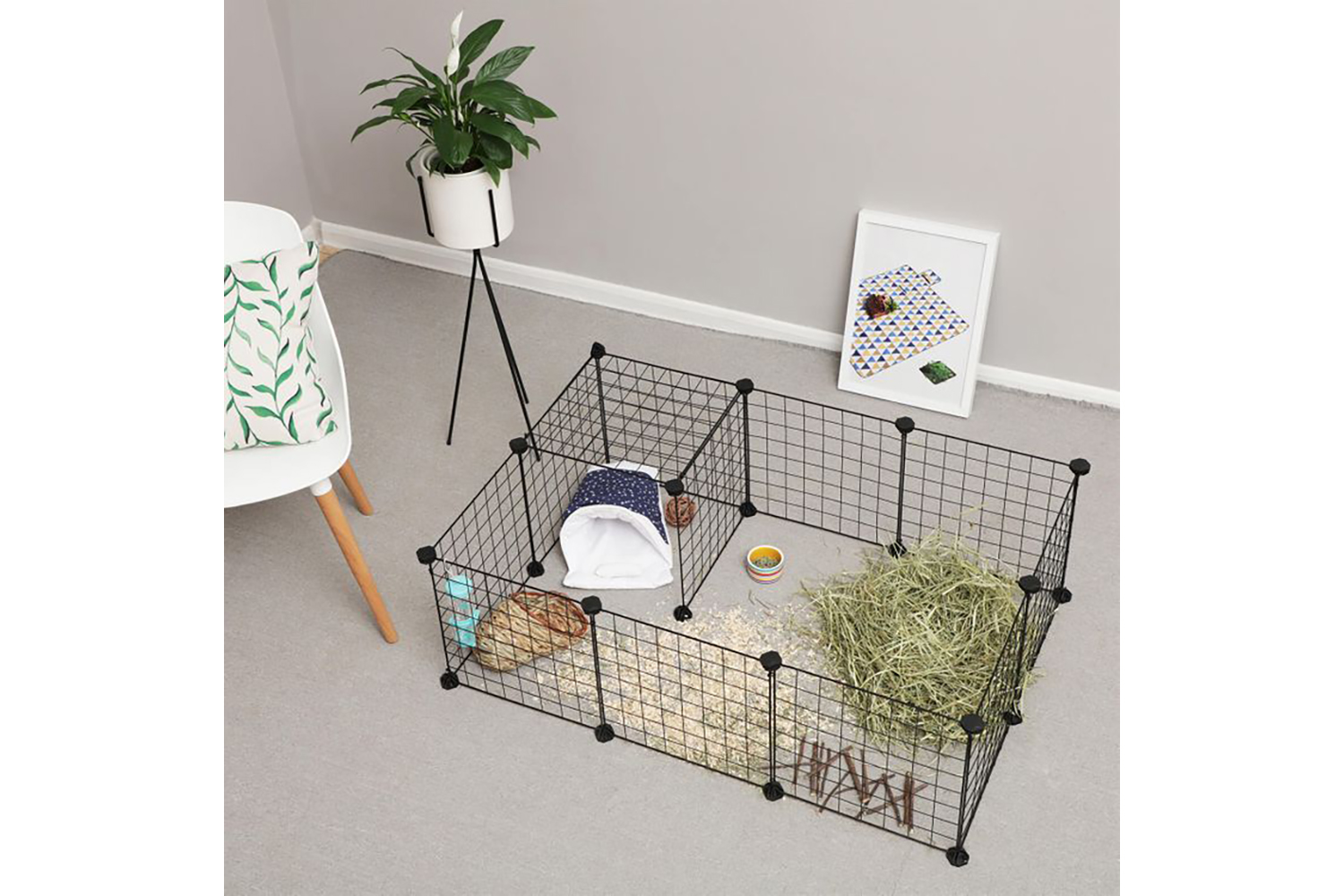 The individual grid panels that are included in the scope of delivery can be assembled individually. For a wide enclosure with a low height or a narrow playpen with a high height.
