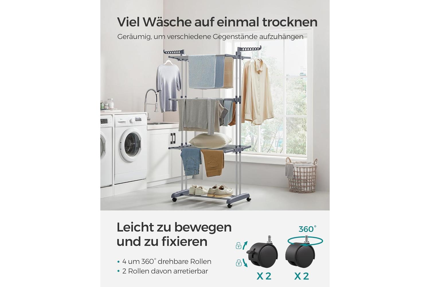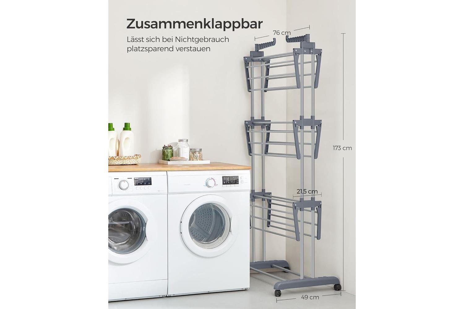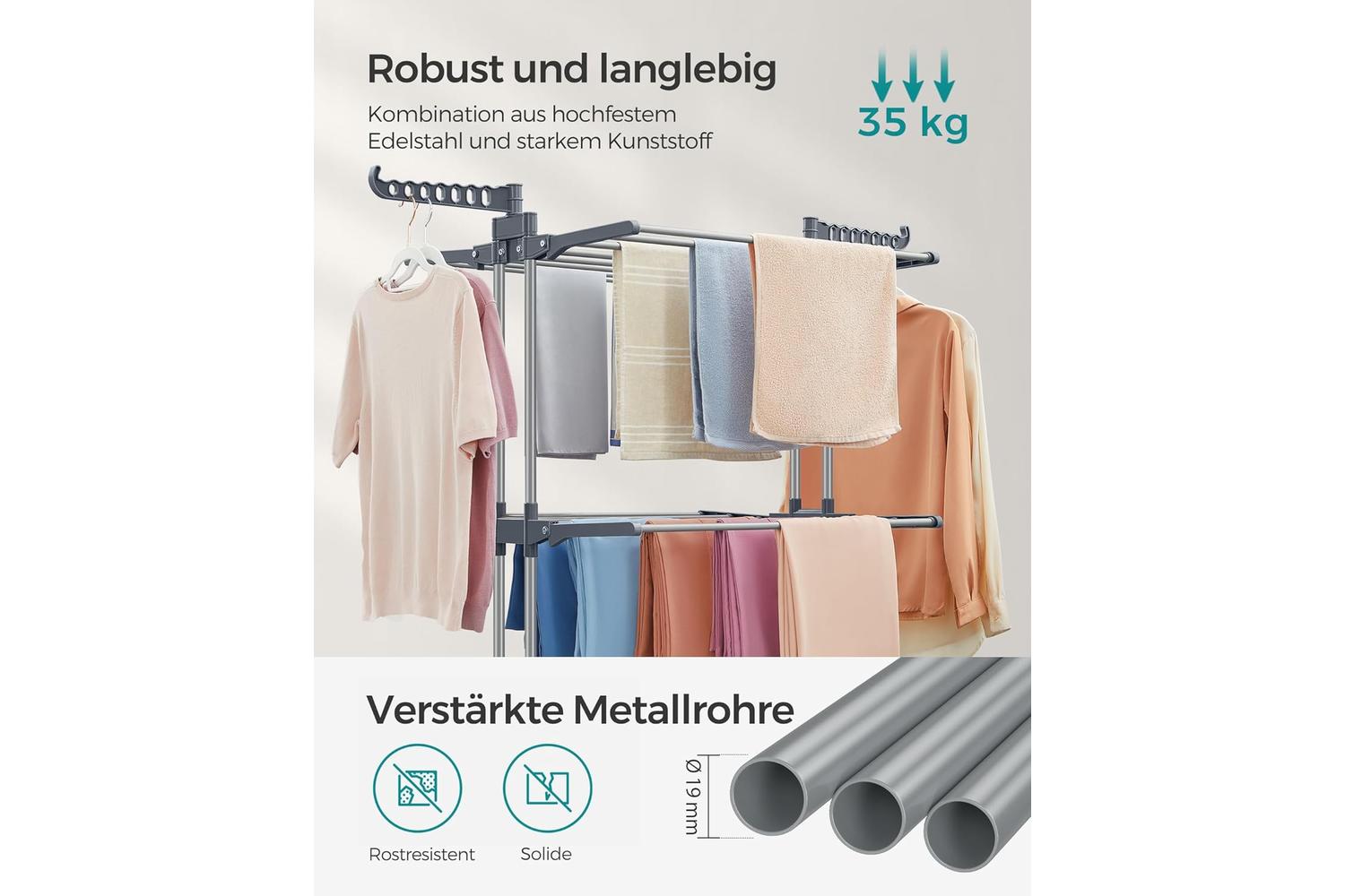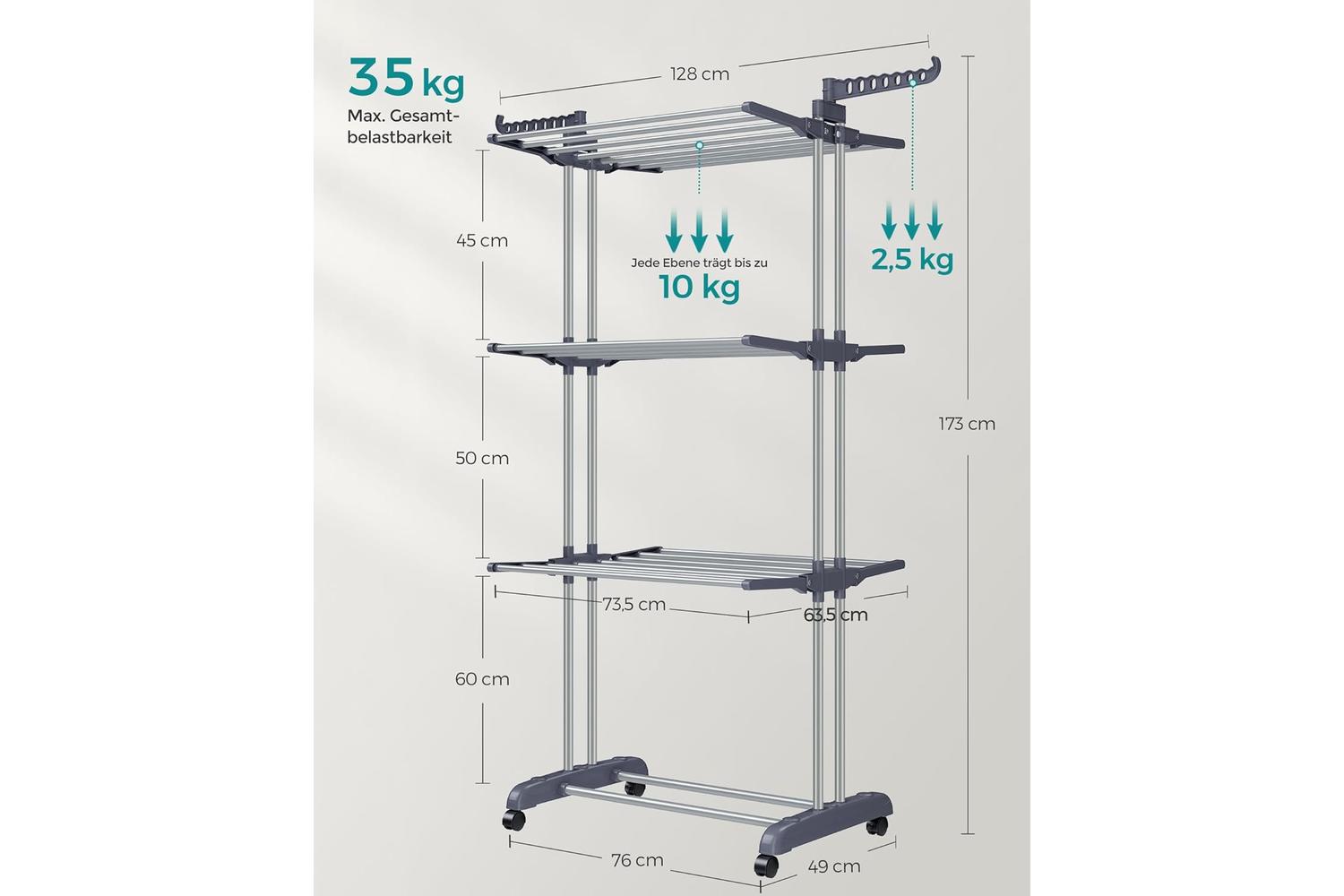 With its generous unfolded size of 64 x 126 x 172 cm, the SONGMICS Clothes Drying Rack provides ample space for hanging clothes, towels, and bedding. The three-tier design maximises drying capacity while maintaining a compact footprint, making it ideal for apartments, family homes, and utility rooms across Ireland. When not in use, the rack folds down to a slim 50 x 76 x 172 cm, allowing for easy storage in cupboards or behind doors.