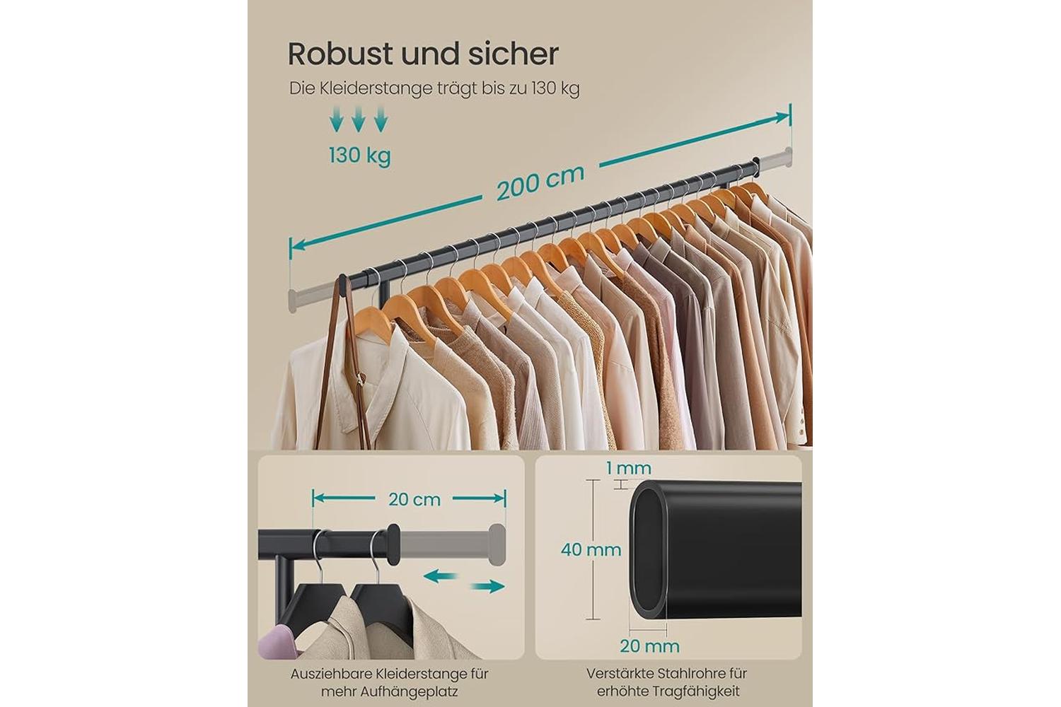 Built with high-quality steel and durable PP casters, the SONGMICS Clothes Rack is engineered to handle up to 150 kg of clothing, making it ideal for heavy winter coats, suits, dresses, and everyday wear. The adjustable width, ranging from 160 to 200 cm, ensures you can customise the rack to fit your space and storage needs. Move it effortlessly from room to room thanks to the smooth-rolling casters, perfect for busy households or those who love to rearrange their space.