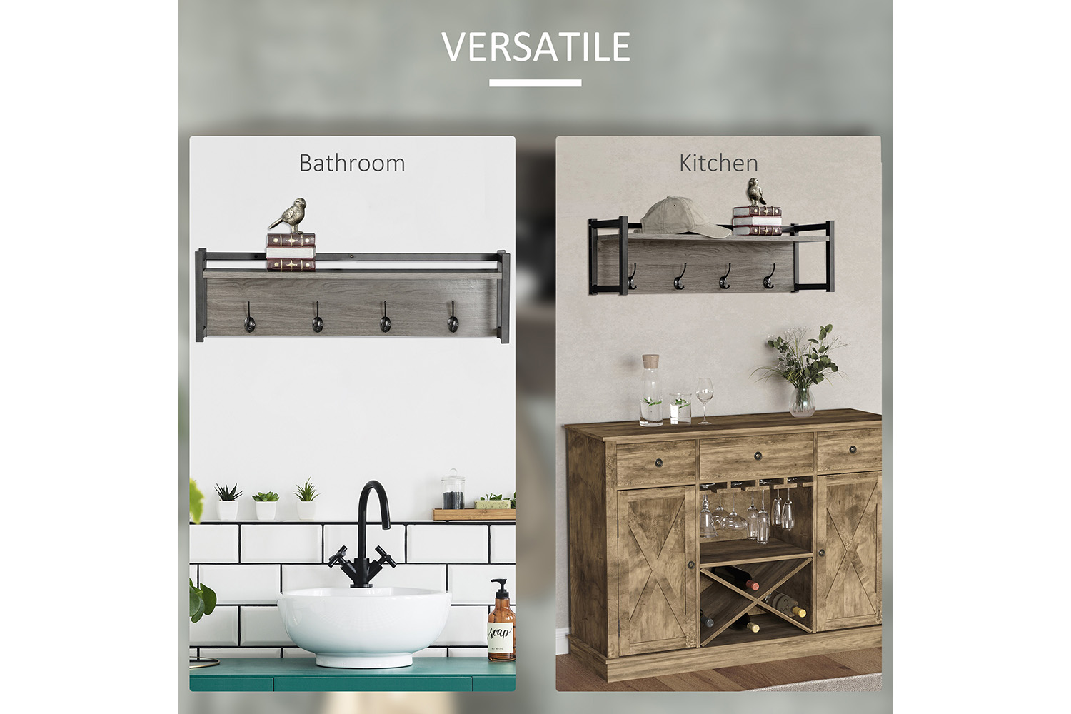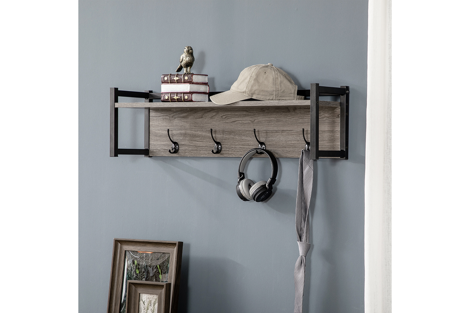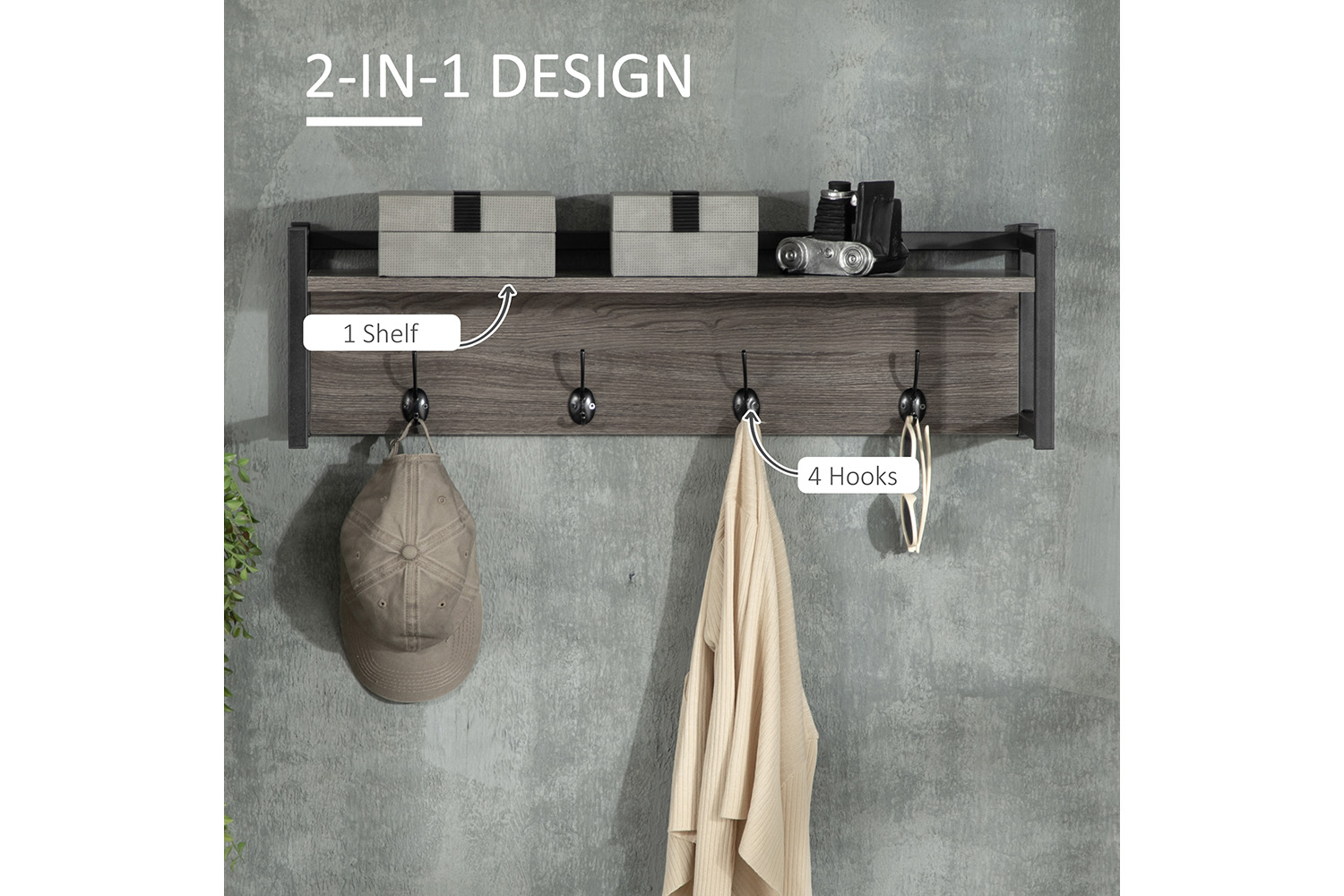 • Combines an open shelf and four hooks