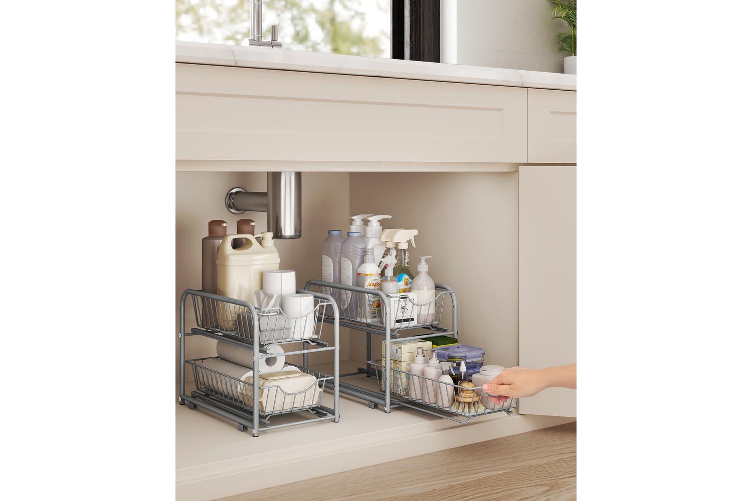 - Versatile two-tier pull-out cabinet organiser for kitchen, bathroom, or utility room