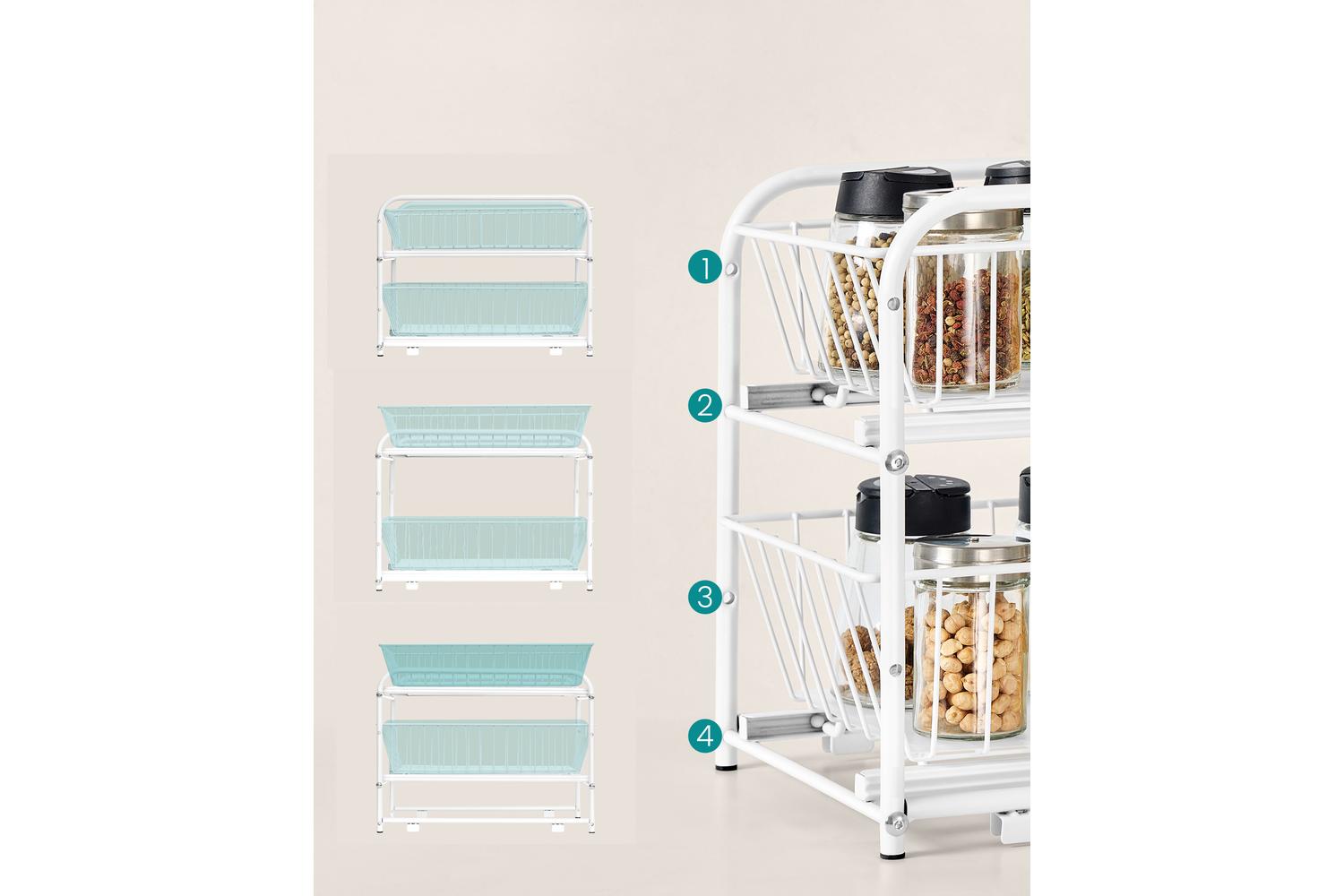 Featuring two practical pull-out drawers, this organiser ensures easy access to all your items. No more rummaging through cluttered shelves—simply slide out the basket and grab what you need. The vertical, space-saving design is ideal for compact spaces, making it a smart addition to any home where storage is at a premium. The adjustable baskets allow you to customise the height, so you can store everything from tall bottles to small jars with ease. Plus, you can combine and stack multiple units to create a tailored storage system that fits your unique needs.