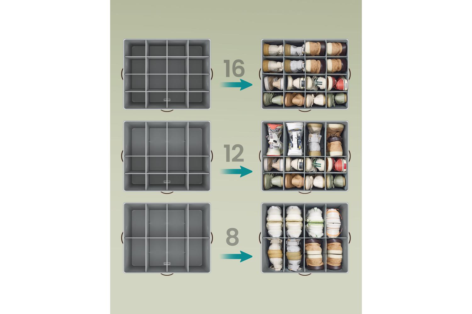 Measuring 54 x 43 x 32.5 cm, this shoe organizer offers ample room to store up to 16 pairs of shoes in one convenient place. The adjustable dividers allow you to customise each compartment, making it easy to fit everything from trainers and boots to sandals and slippers. Whether you need to store shoes, clothes, or bags, this organiser adapts to your needs, making it a versatile addition to any storage and organisation setup.