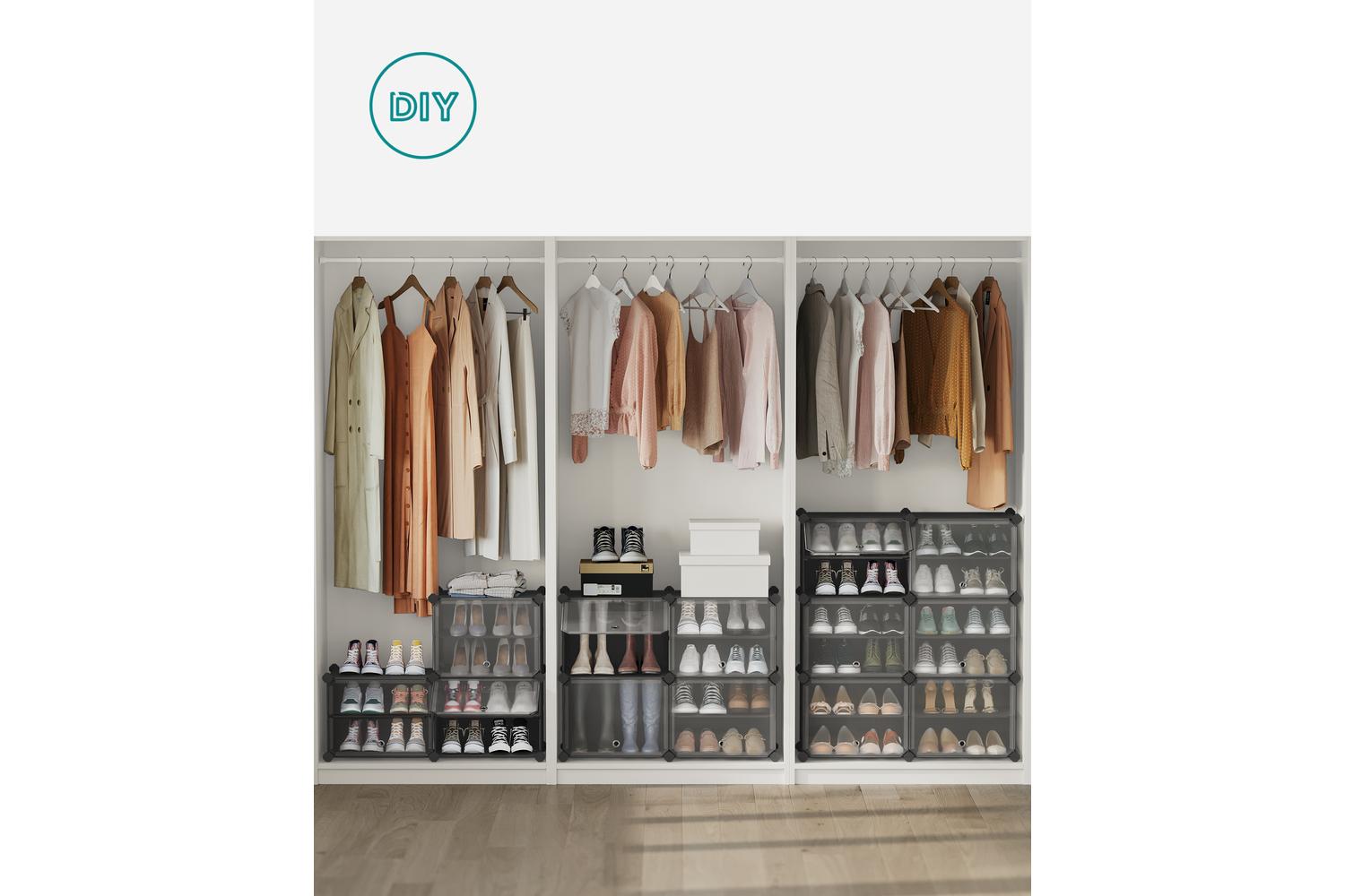- Holds up to 32 pairs of shoes, plus handbags and clothes