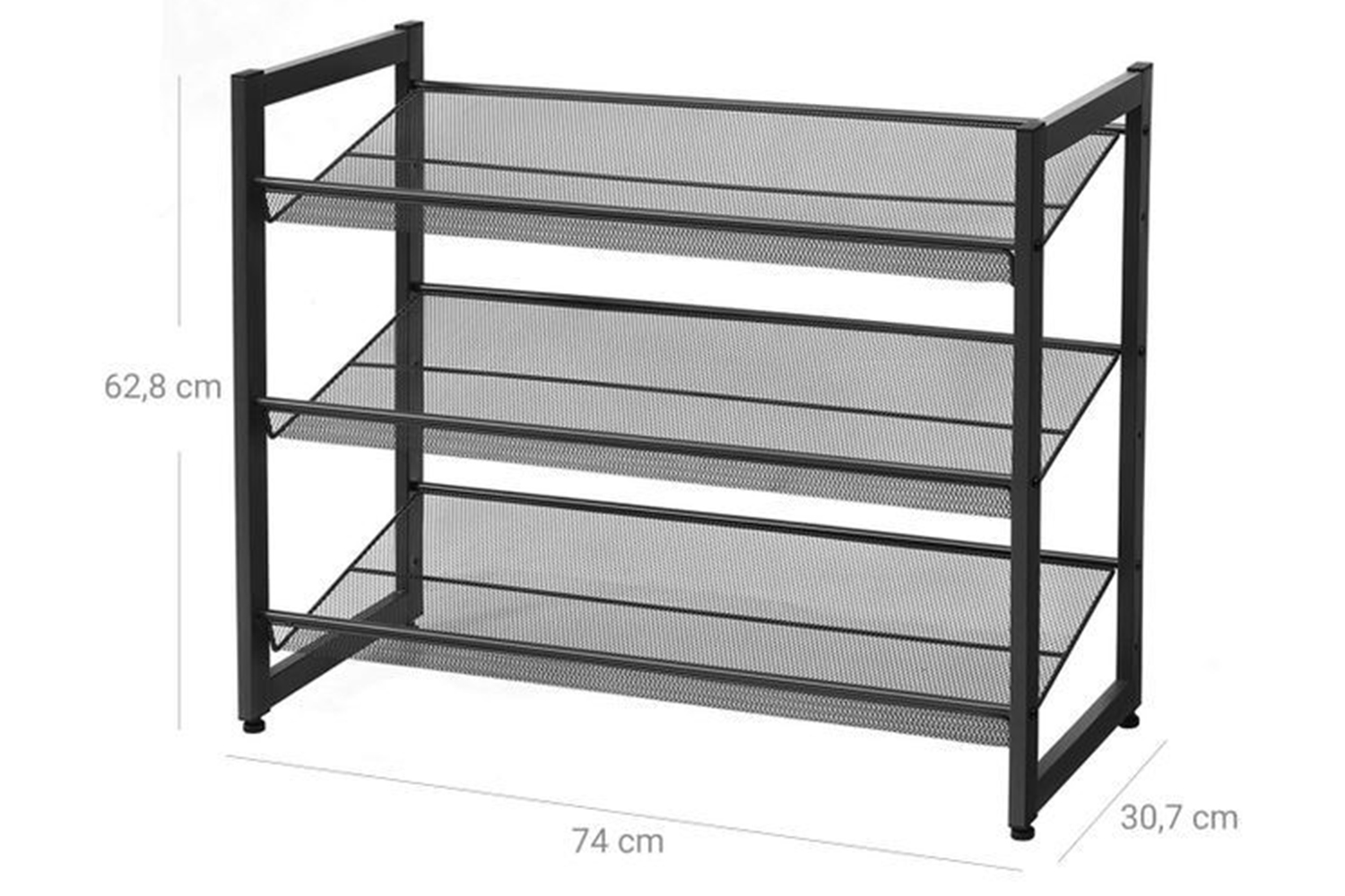 Songmics 3 Tier Metal Shoe Rack, Mesh Shelving Unit, Adjustable Shelves Flat or Angled Shelves, Stackable Storage Rack for Hallway, Entryway, 74 x 62.8 x 30.7 cm (W x H x D) Black LMR03B.