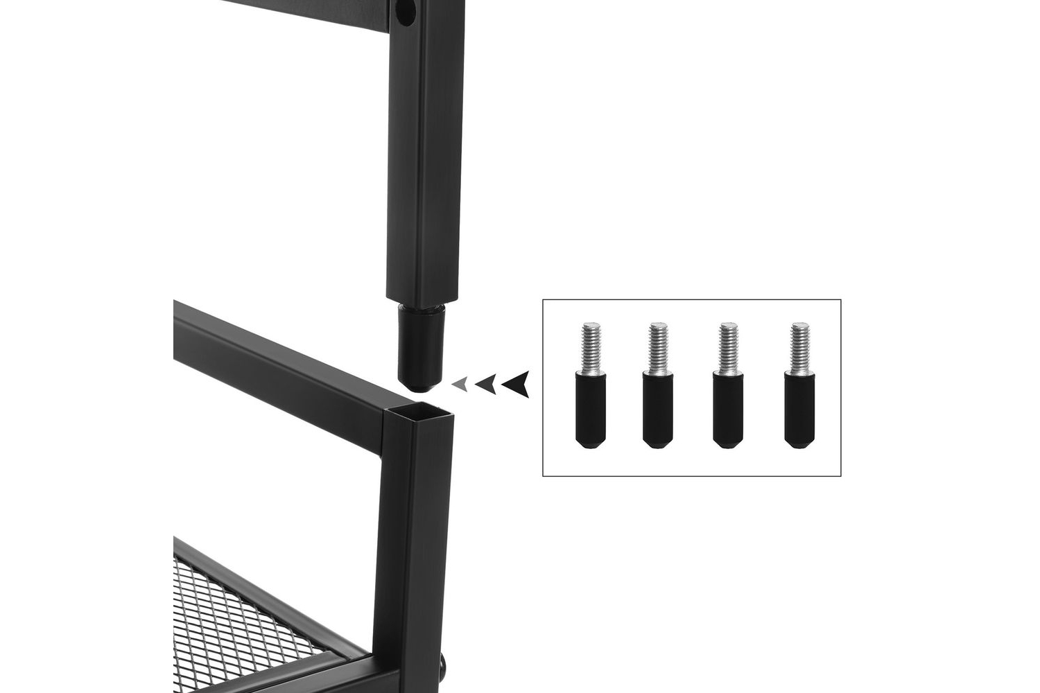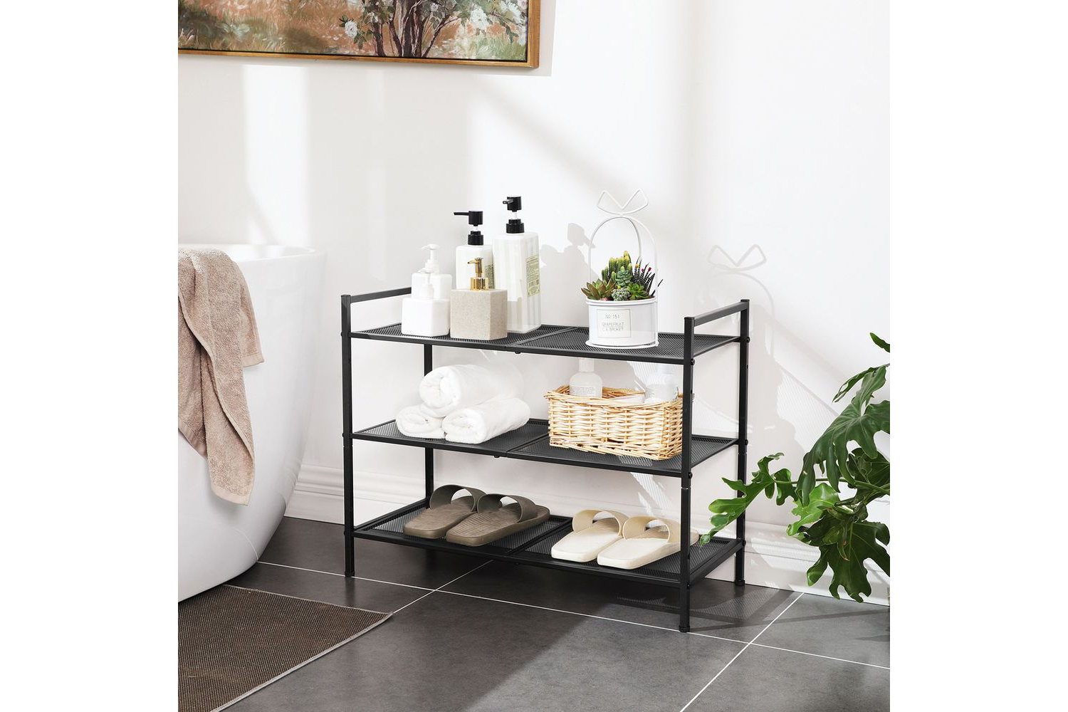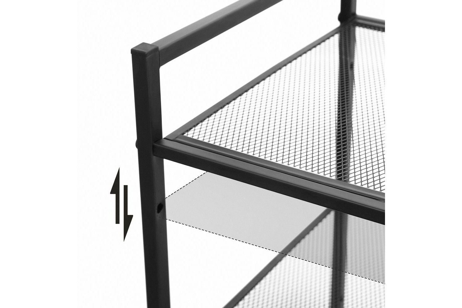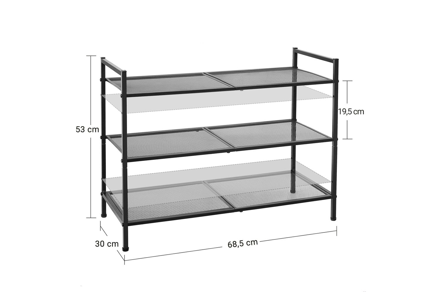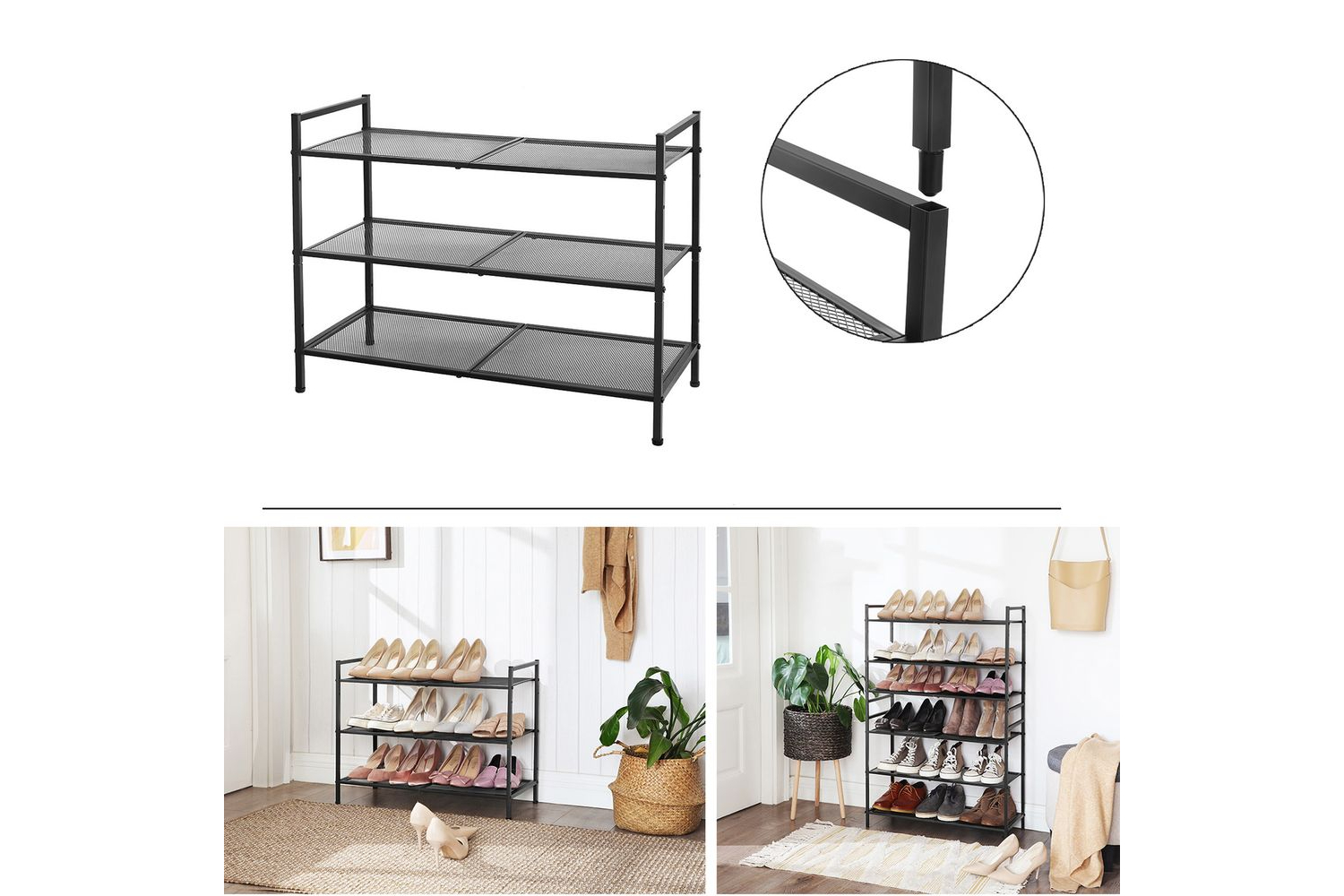 VERSATILE! Still cant find a suitable place for taller work boots? Don't go crazy, try to trap them between the adjustable shelf with 5 height options to fit your needsall your shoes can finally be tamed by this functional shoe rack!FLEXIBILITY SPEAKS A LOT! With a special design and interlocking connectors included, you can buy 2 sets to stack them vertically for a complete and large shoe rack; itll safely hold your ever-expanding shoe collection while saving your valuable floor spaceDURABILITY? NO WORRIES: The robust steel frame of this shoe rack offers great support, each mesh shelf is further reinforced by an extra metal bar to hold up to 10 kg, and adjustable feet add stability even on slightly uneven floors; feel free to put heavy boots or climbing shoes on, it can hold them!IN GOOD HANDS EVERYWHERE: Not only can it be used as a shoe organiser, but succulents can be placed on it to create your small personal garden. Its also a good idea to use it for organising books and magazines in the living roomASSEMBLY SIMPLIFIED: Keeping in mind that simple is better, we provide this shoe rack with a simple structure and clear instructions to you; simply tighten the screws one by one and youll get this unit set up in no timeSpecifications:- Colour: Black- Material: Steel- Product Size: 63 x 30 x 52 cm (L x W x H)- Net Weight: 2.4 kg- Max. Static Load Capacity of Each Layer: 10 kg Package Contents:- 1 x Shoe Rack- 1 x Accessory Kit- 1 x Instructions (EN, DE, FR, ES, IT)