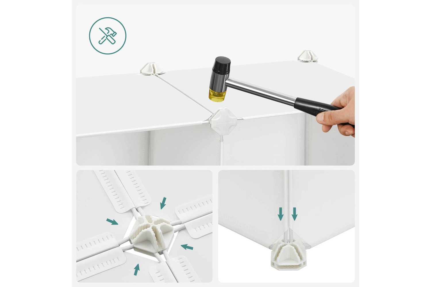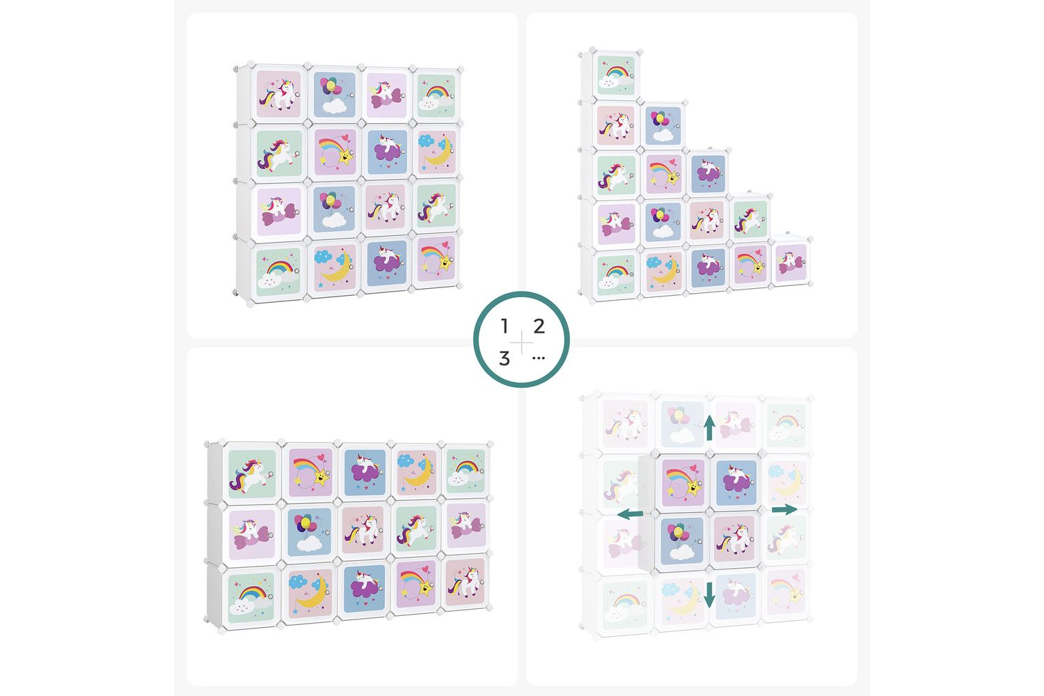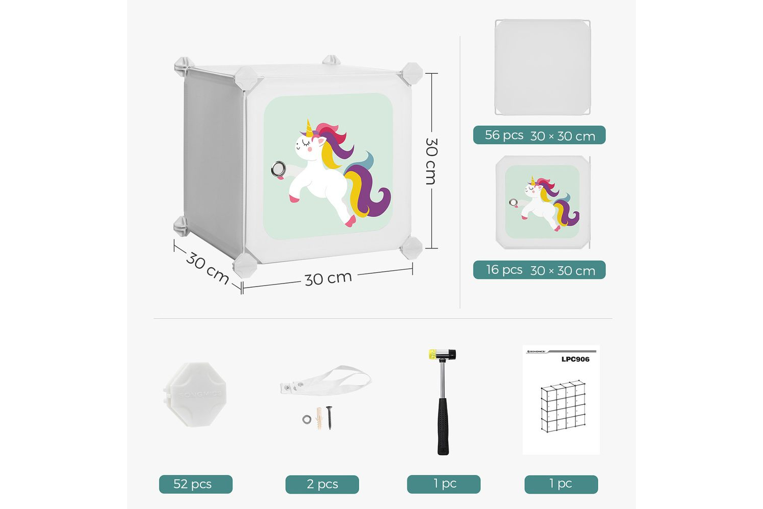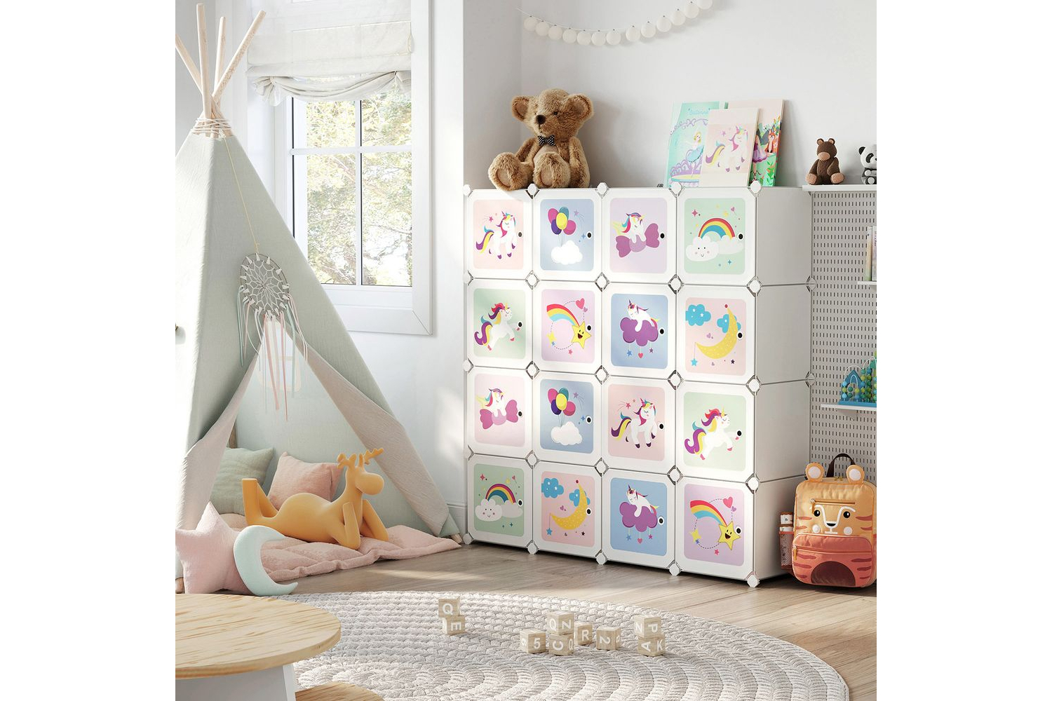 Cleaning up becomes a pleasure: rainbows, unicorns, balloons, stars - this cube shelf conjures up a dreamy fairy tale world into real life. In addition, the beautiful pictures bring your children to store their things in this shelfA stable space: with its thickened PP plastic panels, sturdy metal frame and reinforced plastic connectors, this shelving unit can hold up to 10 kg per cube. An included tilt protection ensures more stabilityOne shelf for everyone: toys, clothes, books - everything fits in this shelving system. What? Are the toy dinosaurs too big for one of each 30 x 30 x 30 cm cubes? Don't worry, just remove a plate. This gives you a larger compartmentEASY ASSEMBLY - We provide you with a rubber mallet and easy to follow instructions - assembling a shelf has never been so easy! In addition, the plastic plates can be easily transported and stored after dismantling the shelfApplaus for this all-rounder: unique pattern, large storage space and practical tilt protection for extra safety - these details make this shelving system a welcome addition to the nursery, playroom or nurserySpecifications:- Colour:White- Material: PP Plastic Sheets with Metal Wire Frame, ABS Connectors- Product Size:123x 31 x 123 cm(L x W x H)- SingleCubeSize: 30 x 30x 30cm(L x W x H)- Product Weight:10.5kg- Max. Static Load of Each Cube:10kgPackage Contents:-56xMilk WhitePanel(30 x 30 cm)- 16xPatternedDoorPanel (30 x 30 cm)-52xWhiteABS Plastic Connector- 1 x Small Mallet- 2 x Anti-Tip Device- 1 x Instructions
