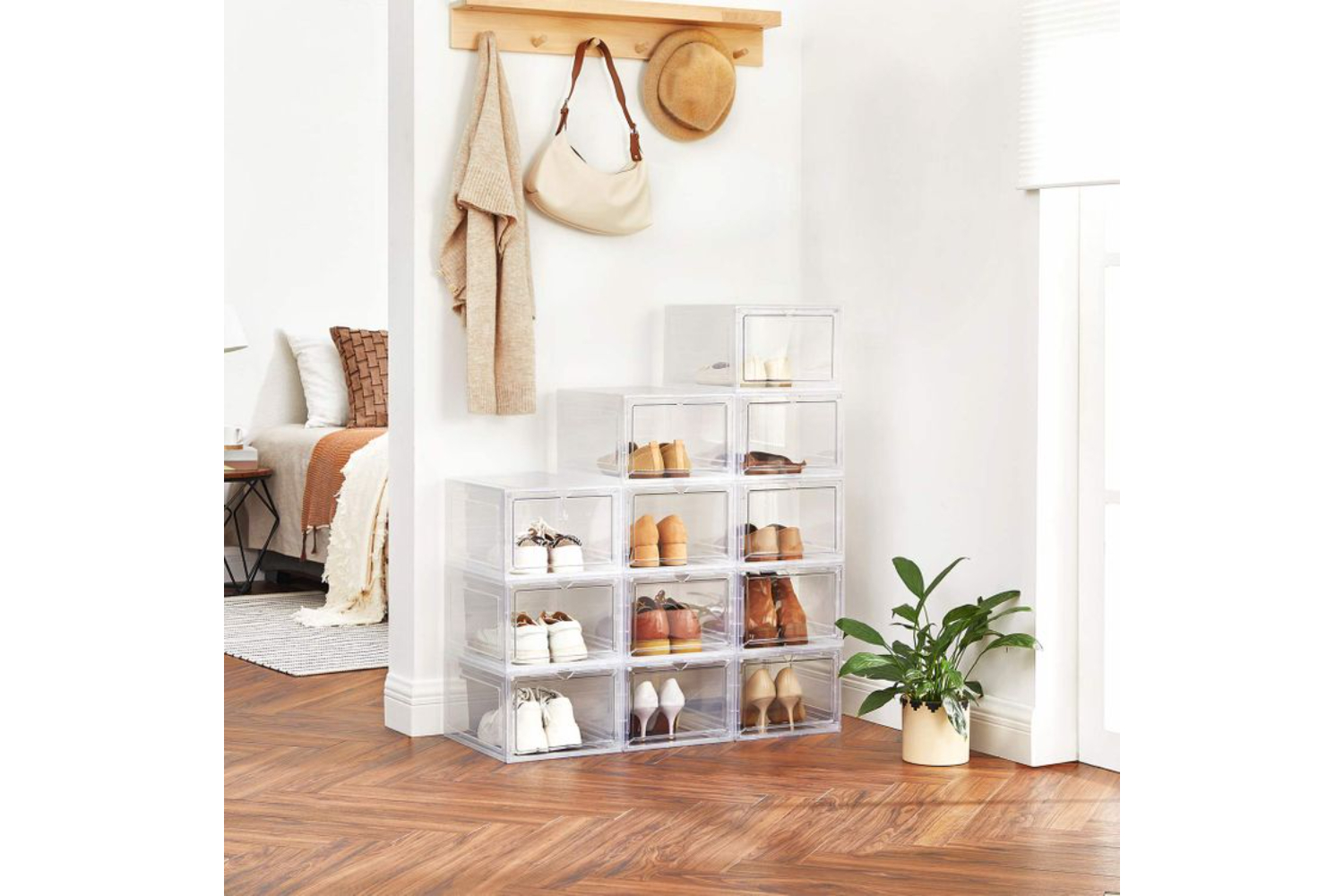 Songmics stackable plastic shoe boxes (sizes up to US 10) will not only help you organize your shoes, but also allow you to choose which one to wear at a glance and grab it with ease.
