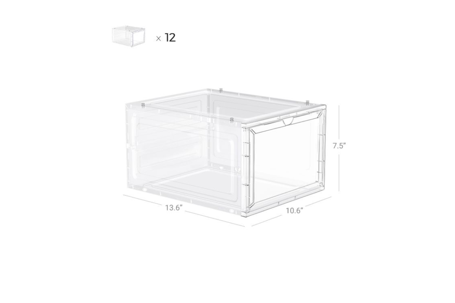 A set of 12 plastic shoe organizers with an inner size of 10” L x 13” W x 6.9” H for up to US shoe size 10, 72 plastic studs for a stackable and expandable design, and a charming touch for your closet, hallway, or bedroom