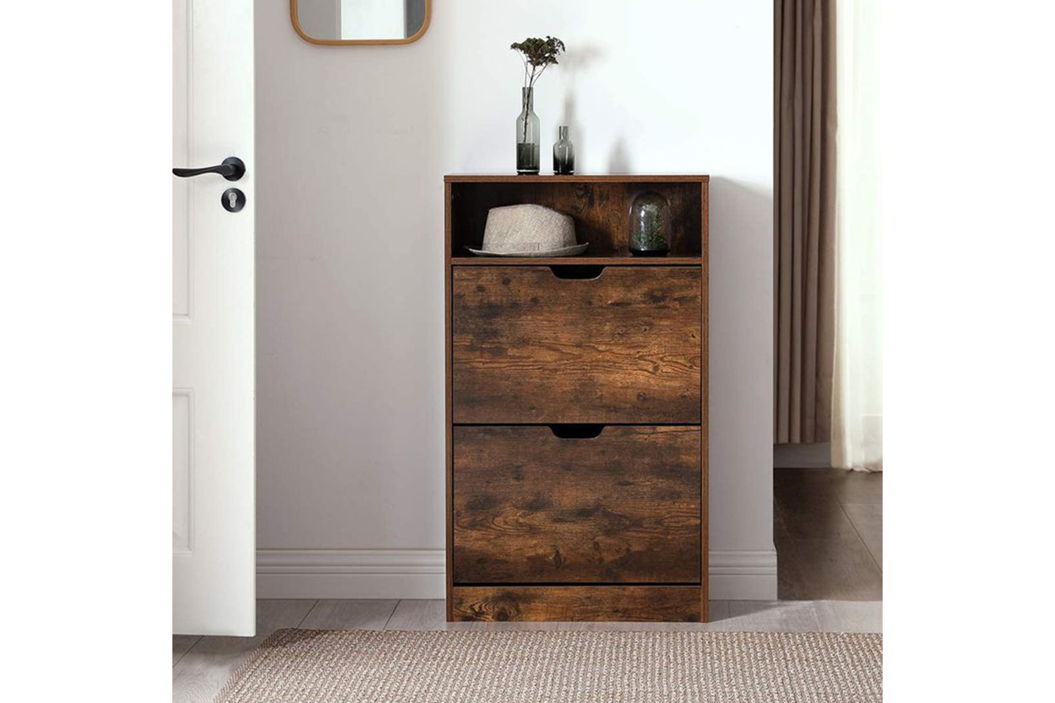 This shoe cabinet is also equipped with an open compartment in which you can store keys, notes, a scarf, hats, or gloves.