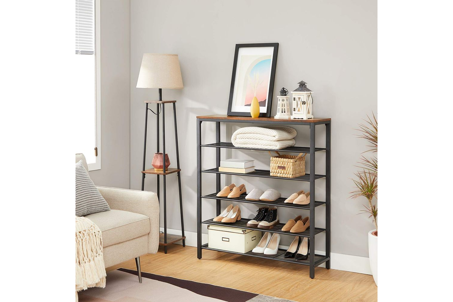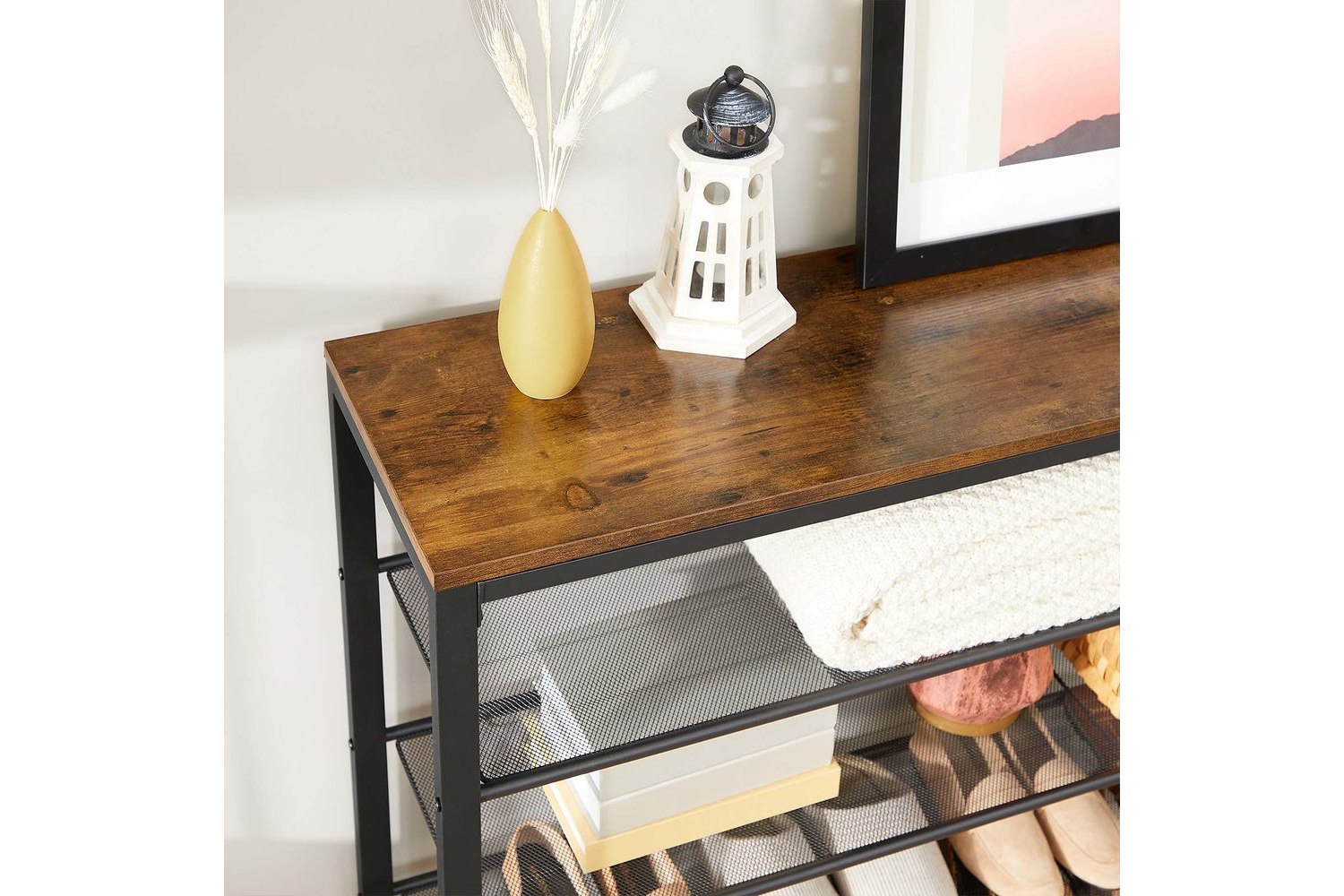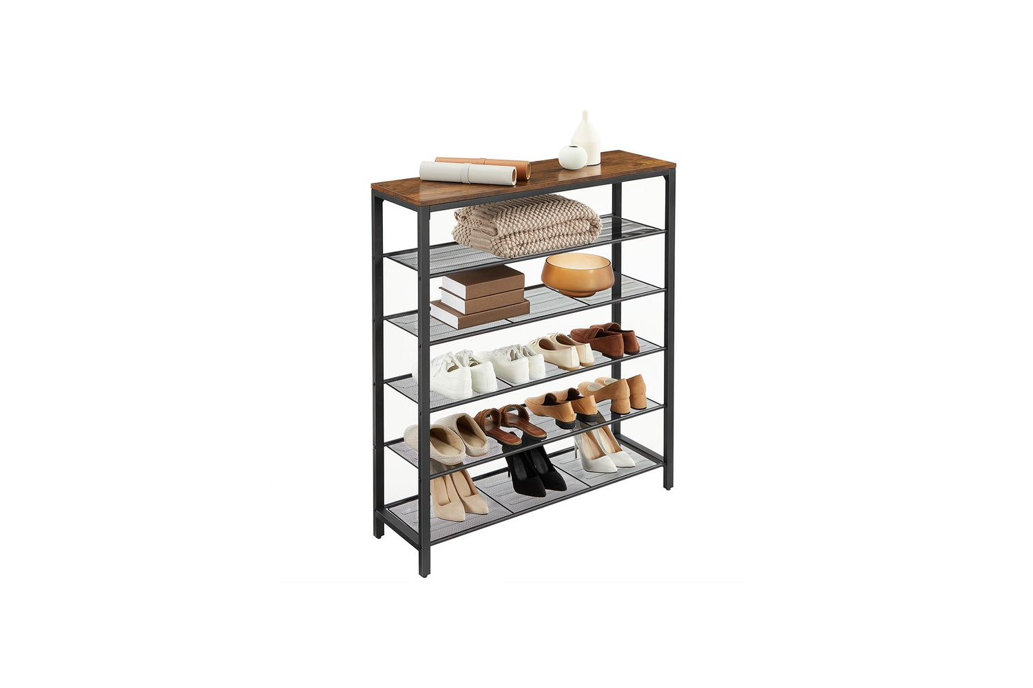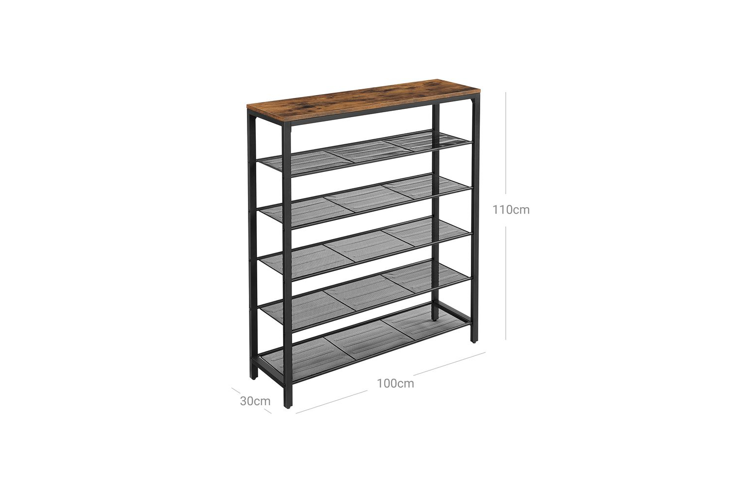 Pack of 3. You will receive a shelf with a stylish wood effect finish - a shoe rack with 5 black grid levels and a stylish factory style decorative piece for your entrance area.No need to worry about storage space! This 5 tier shelf provides enough space for 20 pairs of stylish shoes and gives them an ideal stage on which to shine. The eye-catching vintage surface is great for bags, keys or small plants.No headaches: No complicated assembly - a simple structure with labelled parts and clear instructions. This shoe rack is set up in no time. Keep all your shoes tidyNo wobbling: Are you tired of your shoe rack wobbling as soon as you place a pair of heavy winter boots on it? The steel frame and adjustable feet keep the shoe rack balanced and protect your floor from scratchesWhat you get: A shoe rack with 5 shelves, illustrated instructions and an accessory pack. Give your hallway special character with this stylish piece of furniture from our INDESTIC collectionSpecifications:- Colour: Rustic Brown, Black- Material: Particleboard, Steel- Product Size: 100 x 30 x 110 cm (L x W x H)- Product Weight: 11.2 kg- Max. Static Load Capacity of Top Shelf: 10 kg- Max. Static Load Capacity of Each Mesh Shelf: 5 kg Package Contents:- 1 x Shoe Rack- 1 x Accessory Kit- 1 x Anti-Tip Kit- 1 x Instructions (EN, DE, FR, ES, IT)