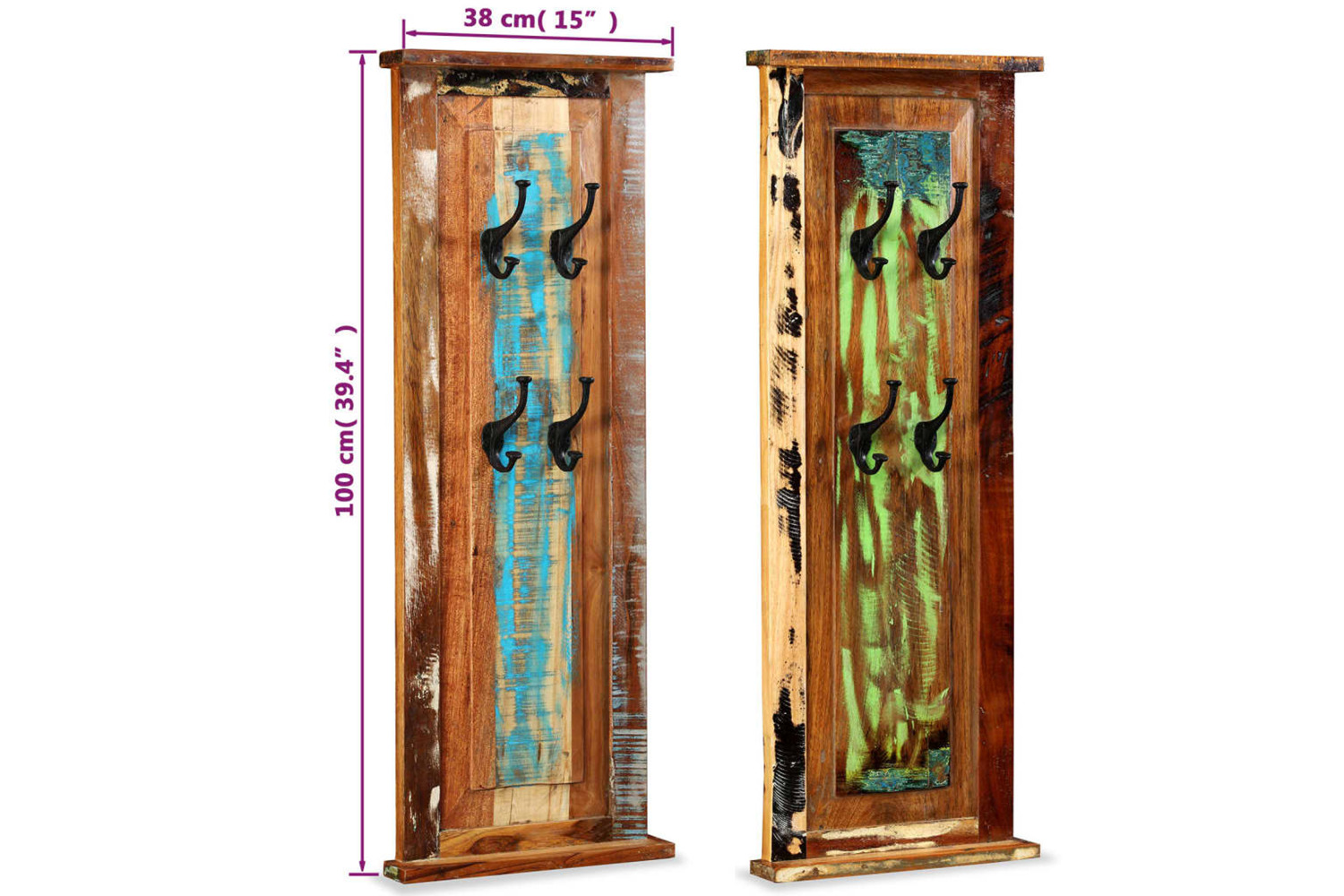 - Material: Solid reclaimed wood + wrought iron hooks