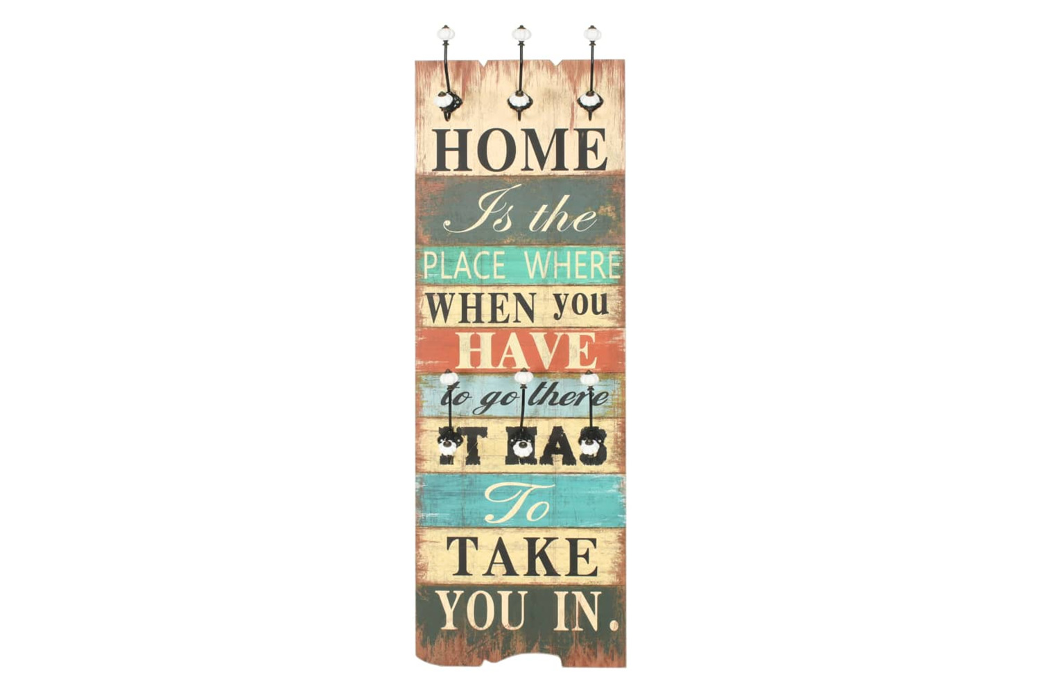With its vintage-style print reading "Home is the place where when you have to go there, it has to take you in.", this wall-mounted coat rack with 6 hooks will become a real eye-catcher that your guests will immediately notice.
