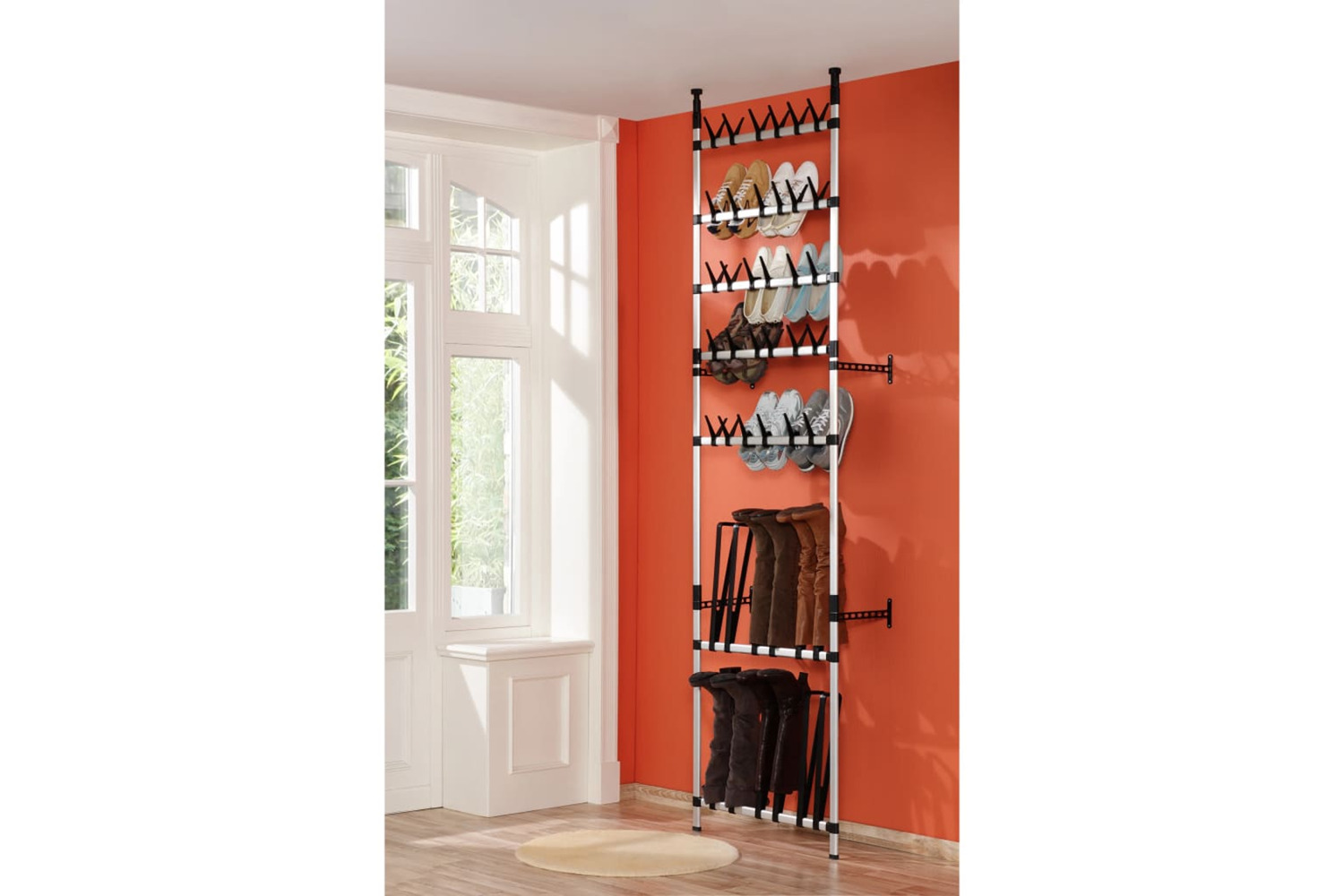 The telescopic shoe rack is made of aluminium, making it sturdy and strong. This storage unit can be adaptable to different spatial arrangements, thanks to its telescopic system and adjustable height. It offers a unique and versatile way to organise your shoes and save space.