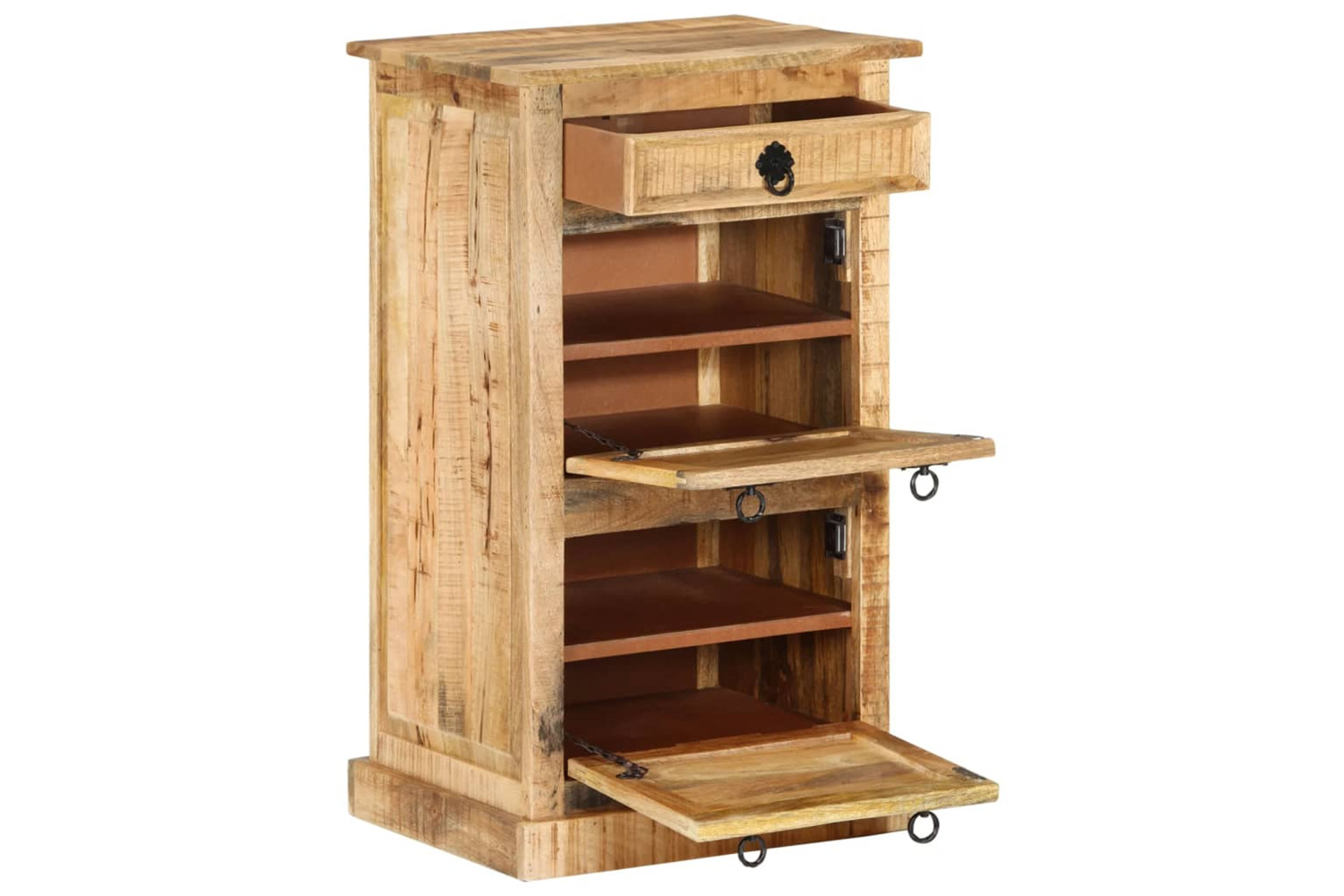 The shoe rack is made of rough mango wood, a tropical hardwood with the strength to bear the weight. It also stands the wear and tear of time, making it stable and durable. Additionally, the exquisite craftsmanship and beautiful wood grains make every piece slightly different from the next. The shoe organiser has 4 shelves, providing ample space for keeping your shoes organised. Thanks to the doors, the shoe organiser protects your shoes from dust and keeps them out of sight. The top drawer is ideal for keeping frequently-used items within reach. It will add a touch of vintage charm to your hallway, living room, bedroom or wherever else you might want to place it.