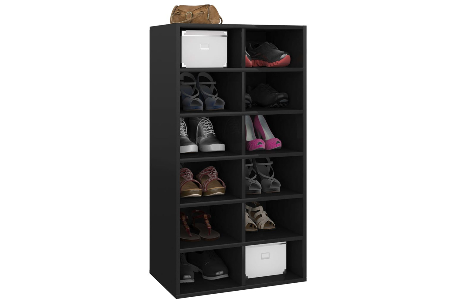 This rack is made of quality engineered wood, which is durable and sturdy for long service life. It is in a simple design, which can fit easily into your existing living space. With ample space of 12 compartments, this rack can accommodate many shoes, storage boxes, hobby utensils, collectibles and more. Wall mounting accessories and a wall anchor to prevent the rack from tipping over are included in delivery. It is easy to clean with damp cloth. The rack is easy to assemble.