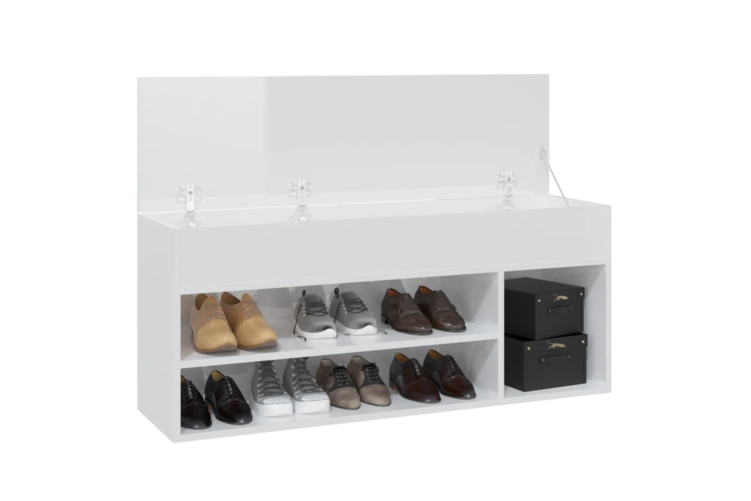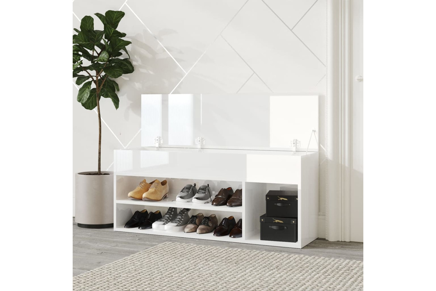 This shoe bench, with a stylish design, makes a great addition to your interior and keeps your shoes organised and well ventilated.