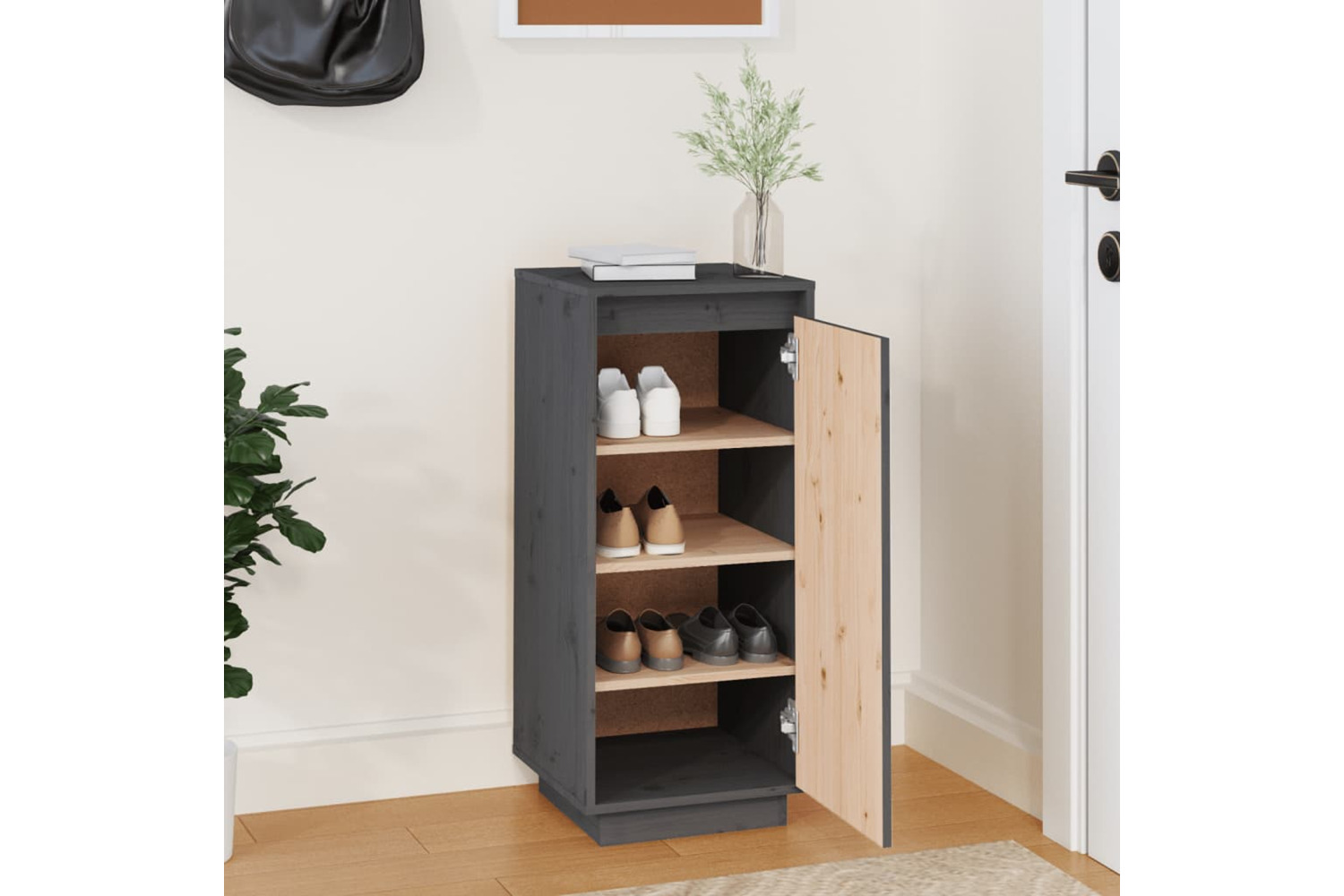 This storage cabinet is made of solid pinewood, making it stable and sturdy. The shoe rack provides ample space for keeping your shoes well organised and within reach. Additionally, the stable top can be used to display decorative objects such as photo frames or potted plants.