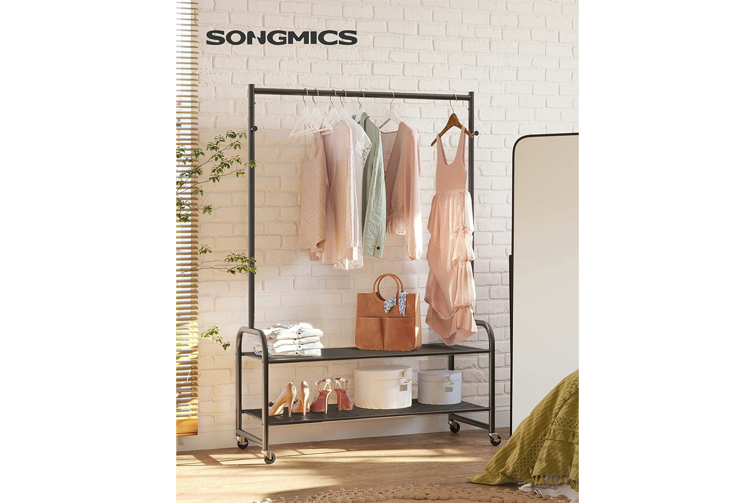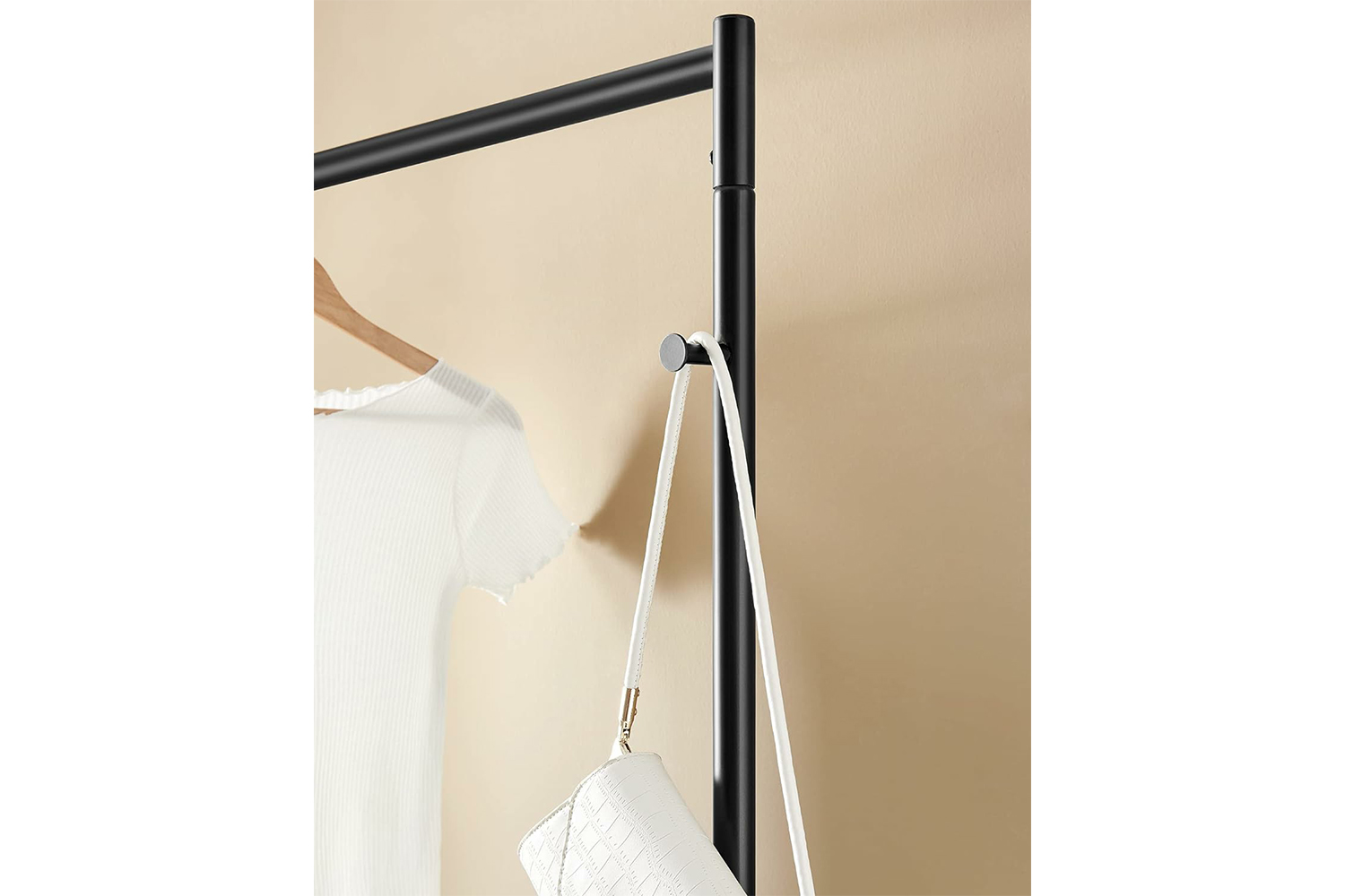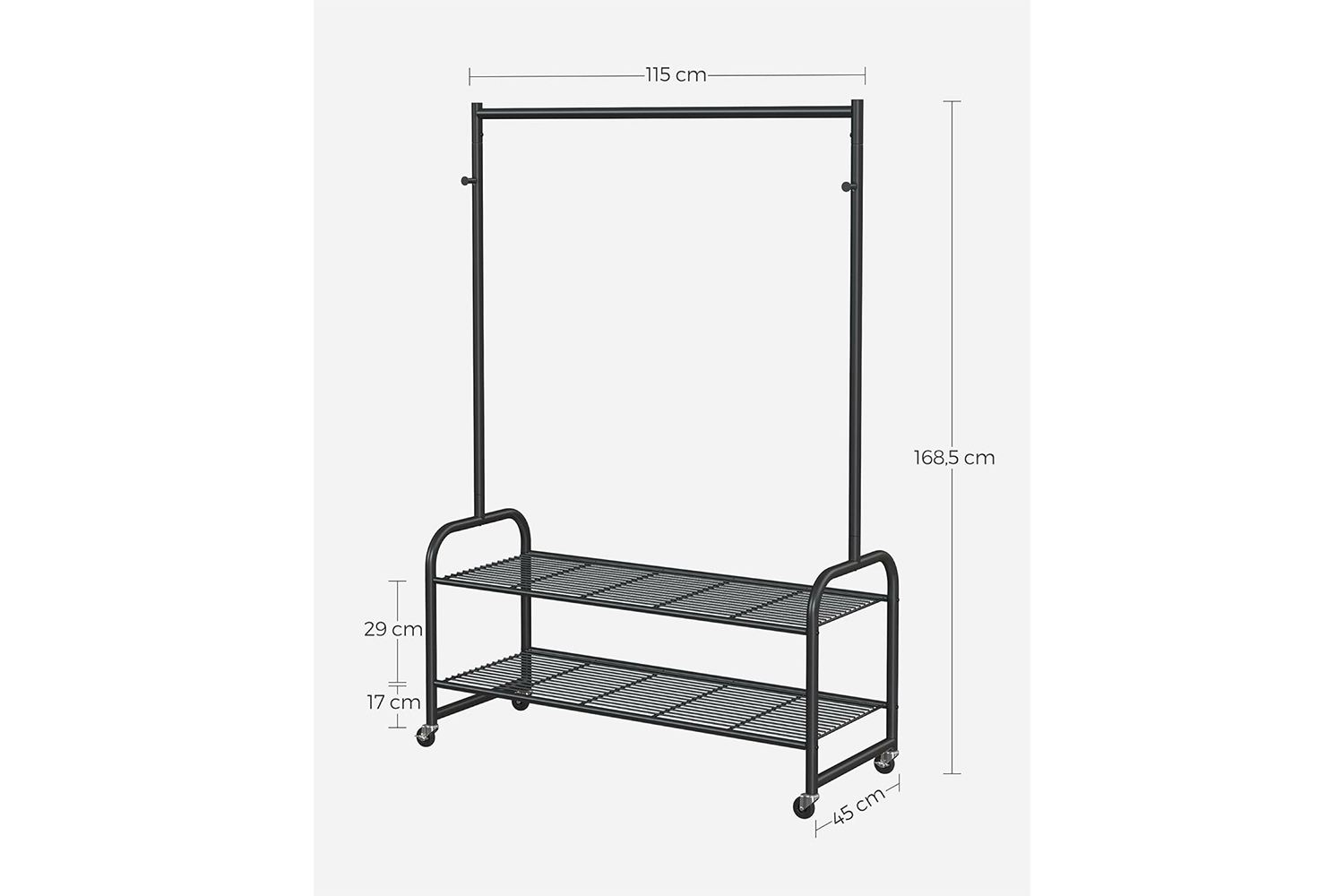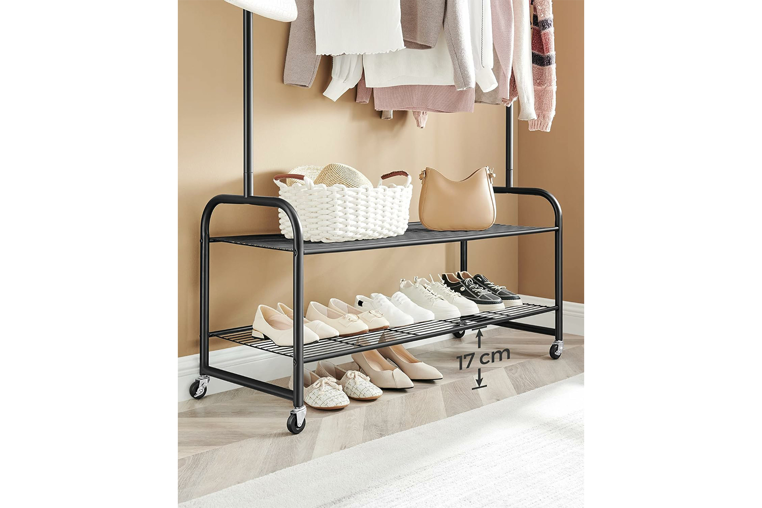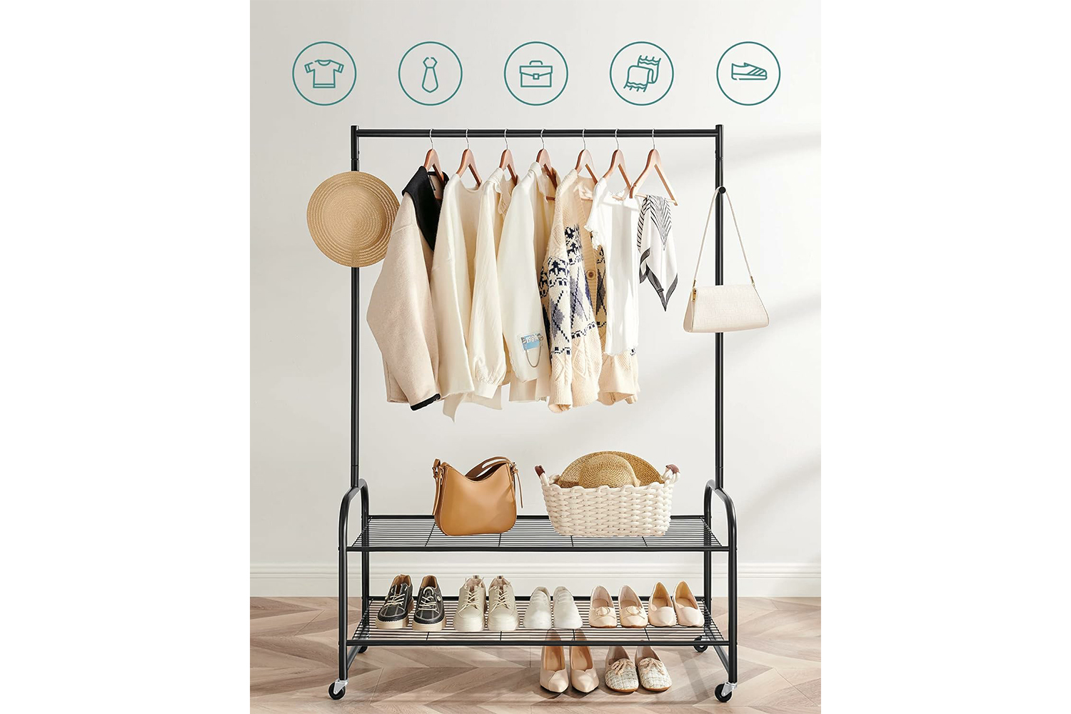 115cm top rail for hanging your clothes, metal hooks on both sides for bags and hats, two large mesh shelves at the bottom for shoes and storage boxes. Everything has its place.