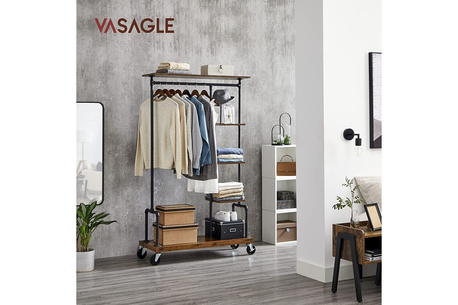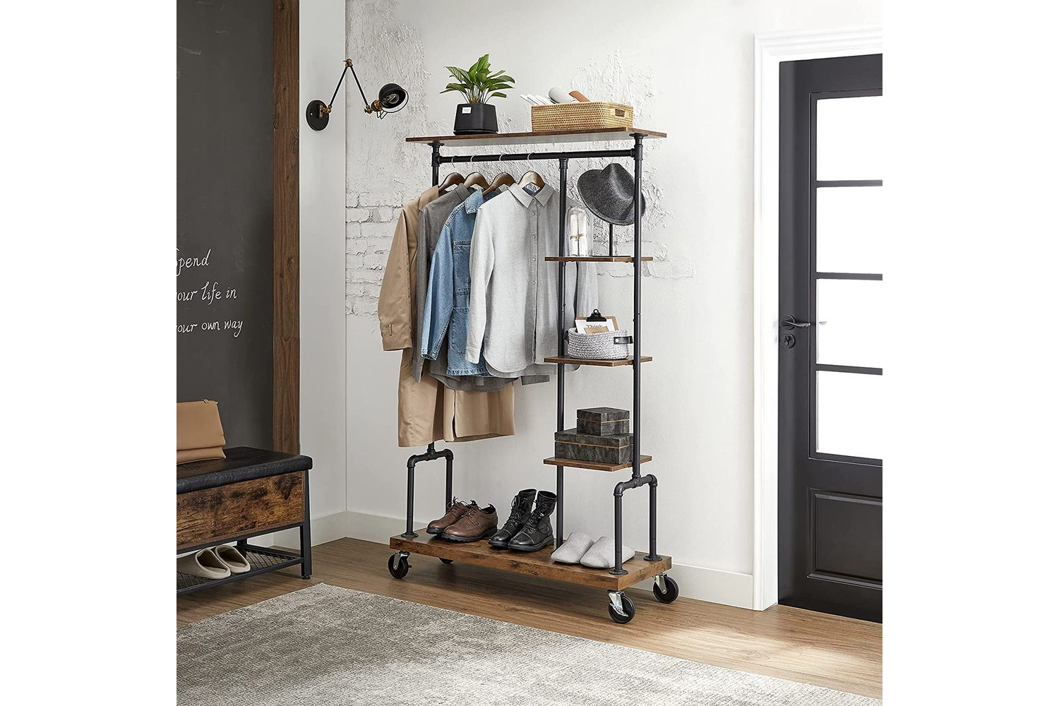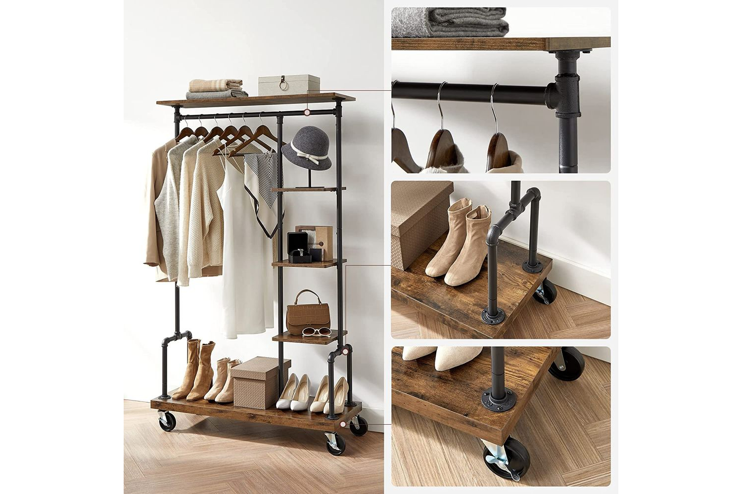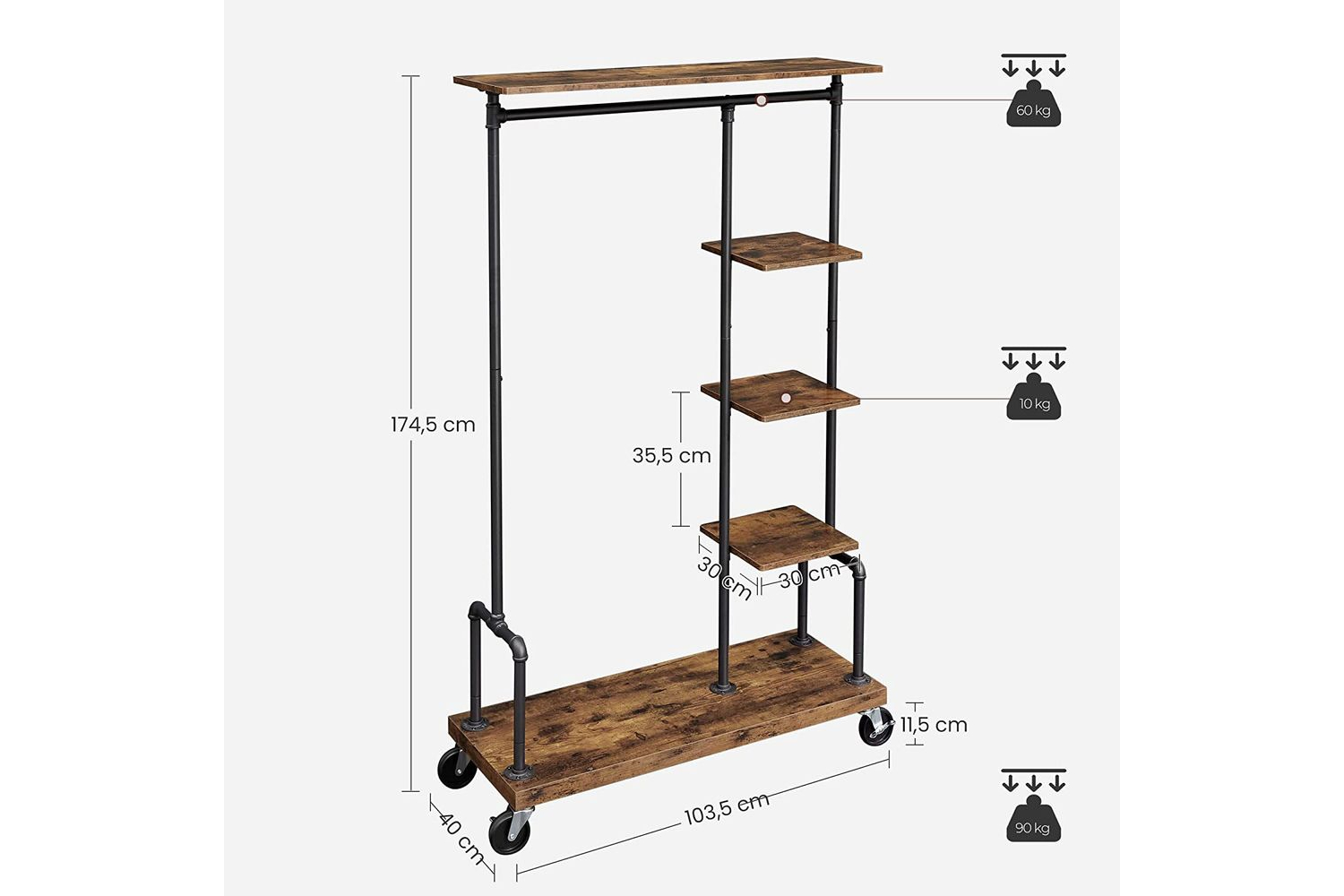 Never Looked Better: Industrial steel pipes paired with rustic particleboardits a pair that defines a room and this clothing rack, compelling eyes to look its way as it shows off your clothes in style, giving them a one-of-a-kind stage to shine onClothes Stay Put: Have peace of mind knowing your clothes will still be hanging where they belong when you get back home; the strong steel pipe rail on this clothing rack supports up to 60 kg of your favourite clothesHang, Show, Prep, Stash: This garment rack isnt actually just for hanging clothesshow your bags on the 3 side shelves, prepare shoes on the bottom shelf, and stash odds and ends away in boxes on the top shelfit welcomes all!Goes Where You Go: Roll your clothing collection from the closet to the bedroom, living room, and beyond with the 4 wheels; 2 are lockable and keep this clothes rack in place while you try on outfitsEasy-Breezy Assembly: Labeled parts? Check. Detailed instructions? Check. A straightforward assembly process? Check! Then, assembling this clothes rack wont feel like a second joblets do itSpecifications:Colour: Rustic BrownMaterial: Particleboard, SteelProduct Size: 103.5 x 40 x 174.5 cm (L x W x H)Product Weight: 20.8 kgMax. Load Capacity for Hanging Rod: 60 kgTotal Max. Load Capacity: 90 kgPackage Contents:1 x Clothes Rack1 x Assembly Kit1 x Instructions (EN, DE, FR, ES, IT)