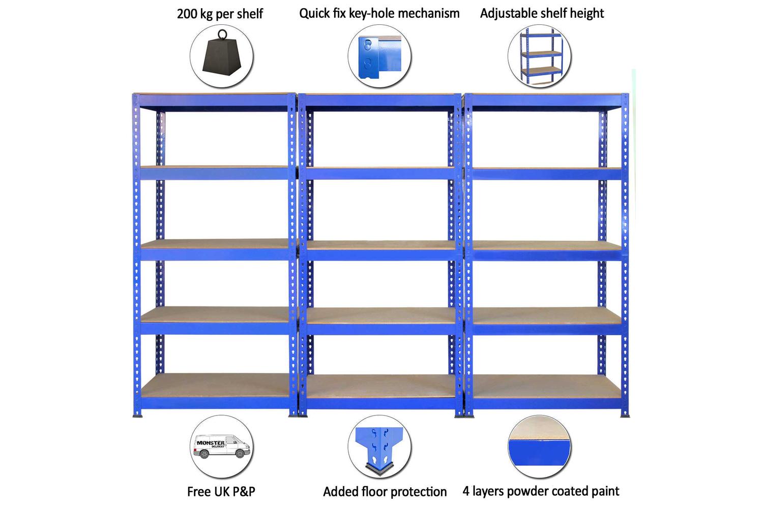 Give your storage space a complete makeover with MONSTERSHOP 7001(3)#7002(2) - 3 x Q-Rax Racking Blue 90 x 50. This mega bundle includes 3 large and 2 extra-large racks from the popular and robust Q-Rax shelving range, trusted by numerous Irish households and businesses for their storage needs. Designed for fulfilling a variety of needs, this product classifies under the DIY, Storage and Organisation, and Garage Shelving categories. Its intent, to simplify storage in your garage, warehouse, utility room, shed, or greenhouse.
