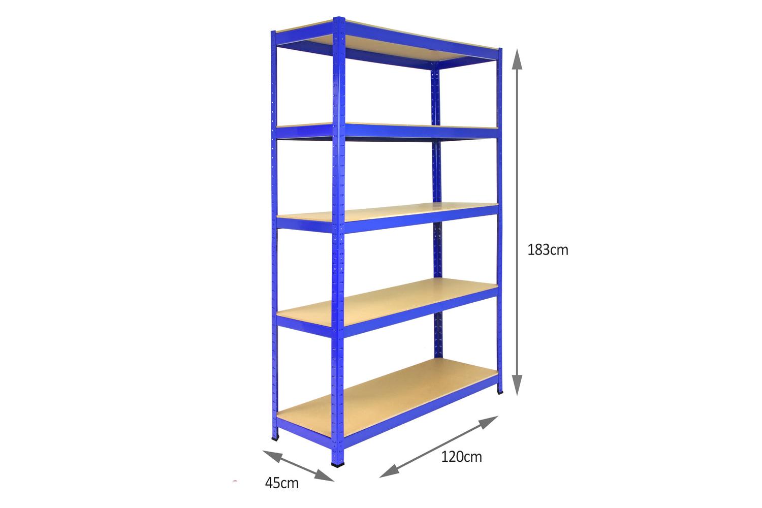 This sale is for 5 x blue Monster garage / warehouse racks from the T-Rax Range. They're extra wide, 100% boltless, Monster strong and each measures 1200mm x 450mm x 180mm (w x d x h).