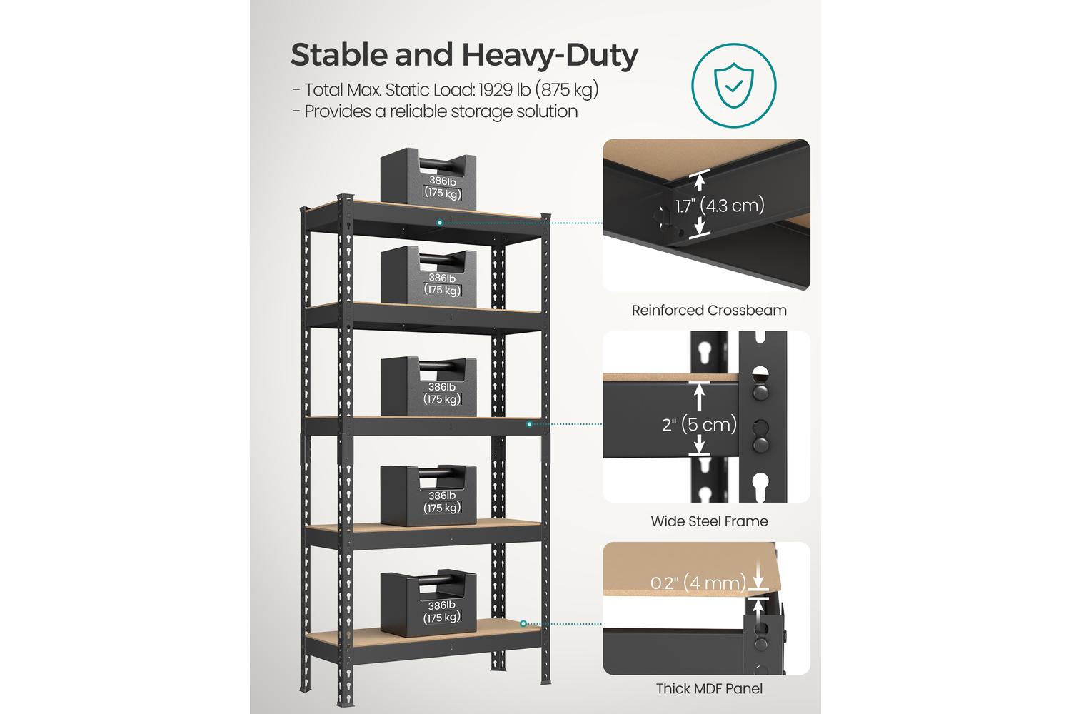 Built with a solid steel frame and reinforced with sturdy MDF shelves, each tier of this shelving unit supports up to 175 kg, making it ideal for storing everything from bulky boxes to heavy equipment. The reinforced crossbars add extra stability, ensuring your items remain secure and the structure stands firm, even under substantial loads. Perfect for busy garages, sheds, or commercial spaces, this shelving is engineered to last.